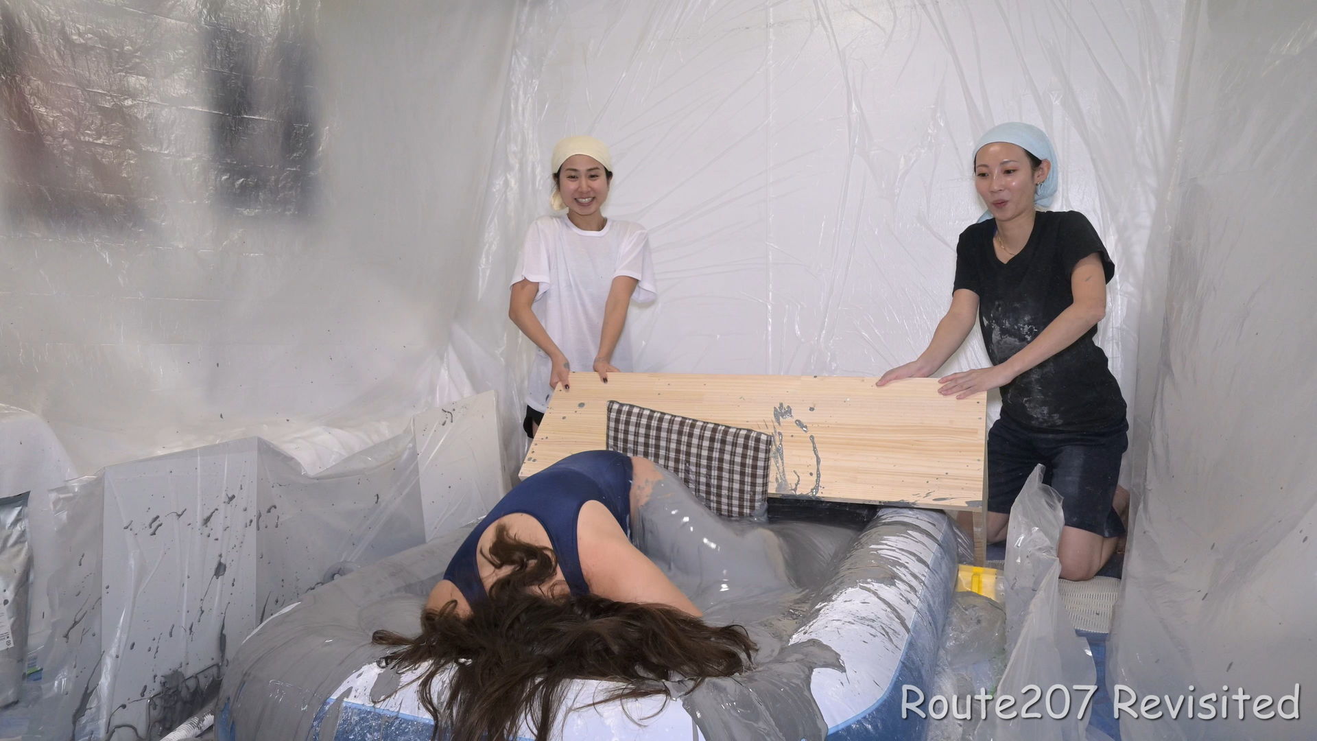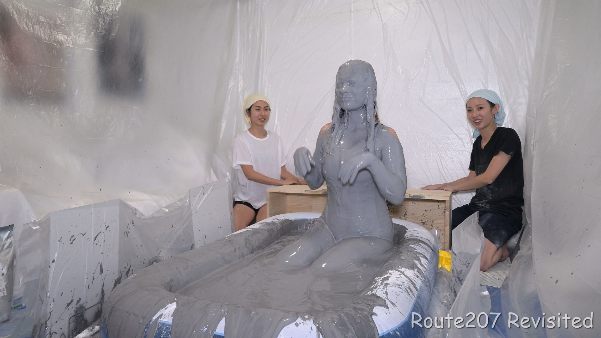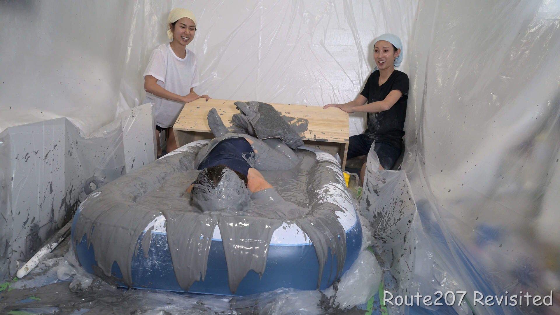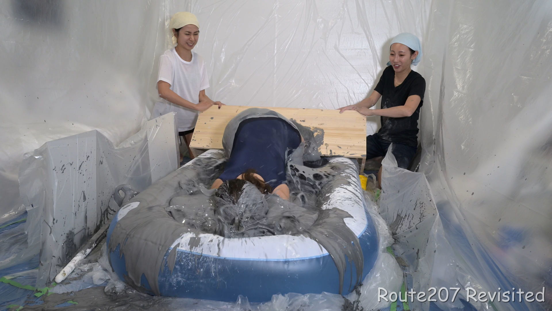 落下は2回だけです。ほんの少しだけ、全身浸かったり手桶で泥を浴びたりして、泥んこ遊びもしています。リハーサルという部分に焦点を当てているため、ふだんの作品では編集時にカットしている、段取りの確認の会話も含まれています。