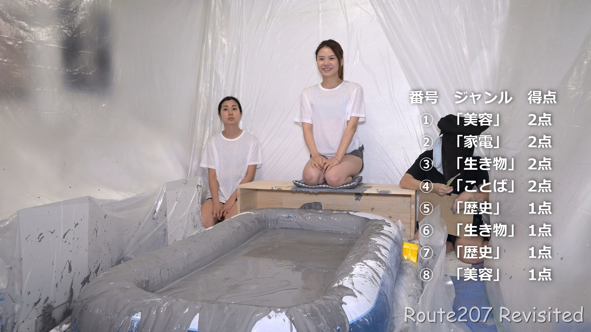モデルさん2人による、泥落ちクイズ対決です。解答者は泥のビニールプールの前に置かれた台に座り、○×クイズ(マルバツクイズ)に挑戦して、不正解の場合には台が傾けられ、泥に落とされます。
