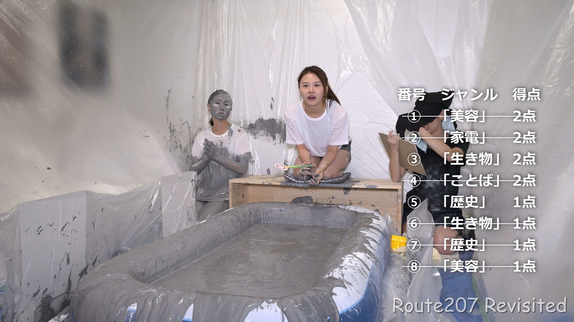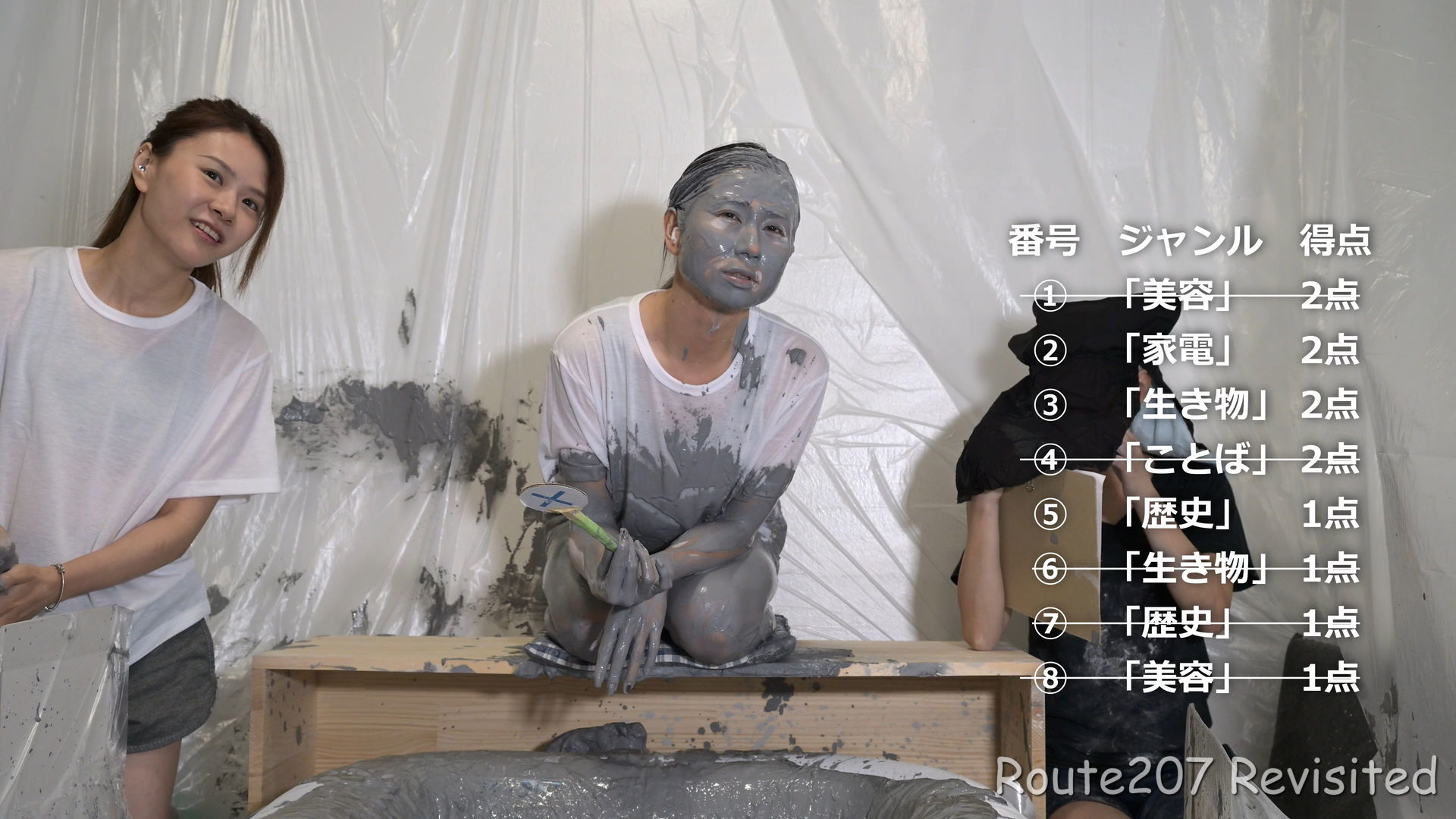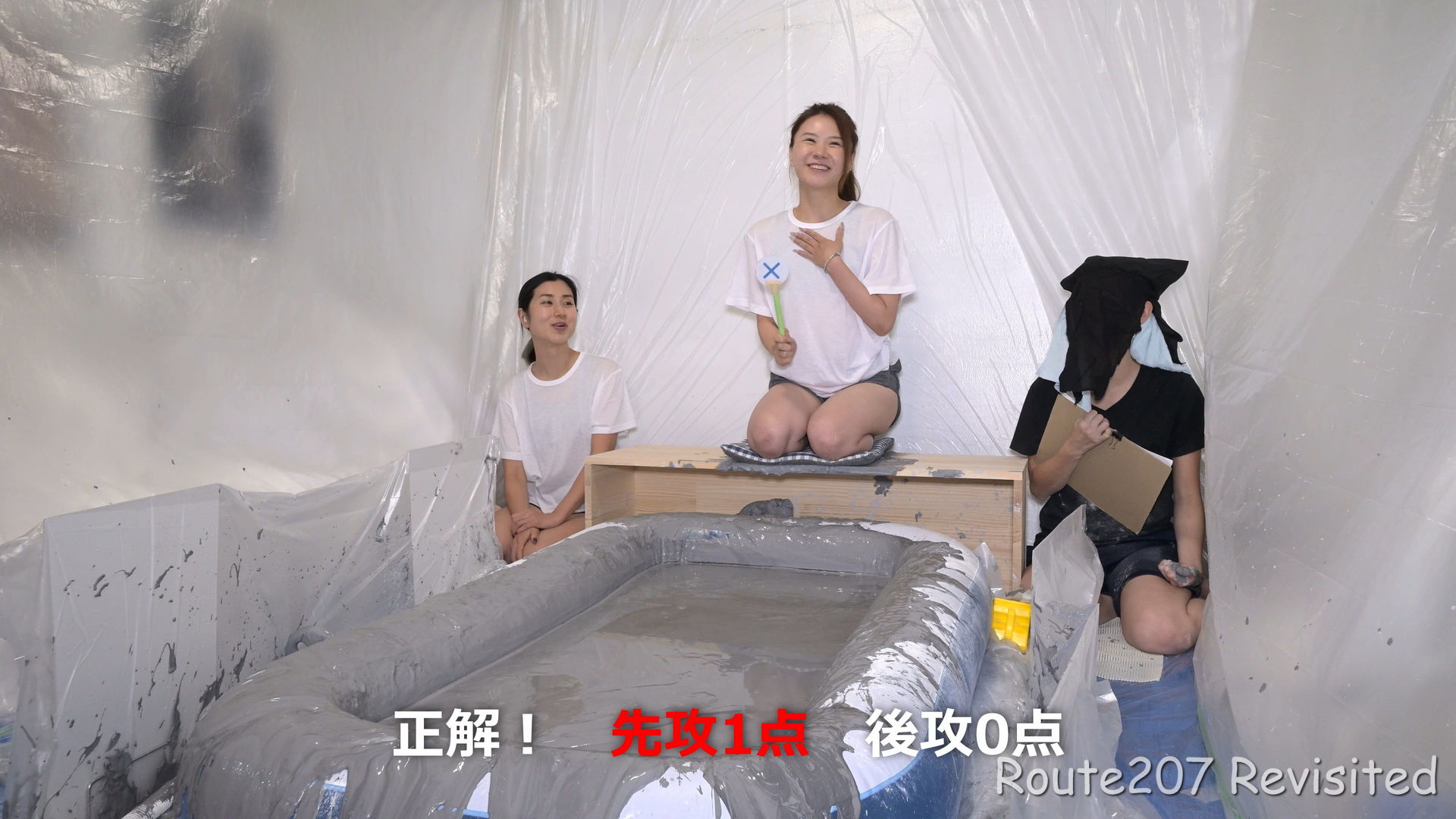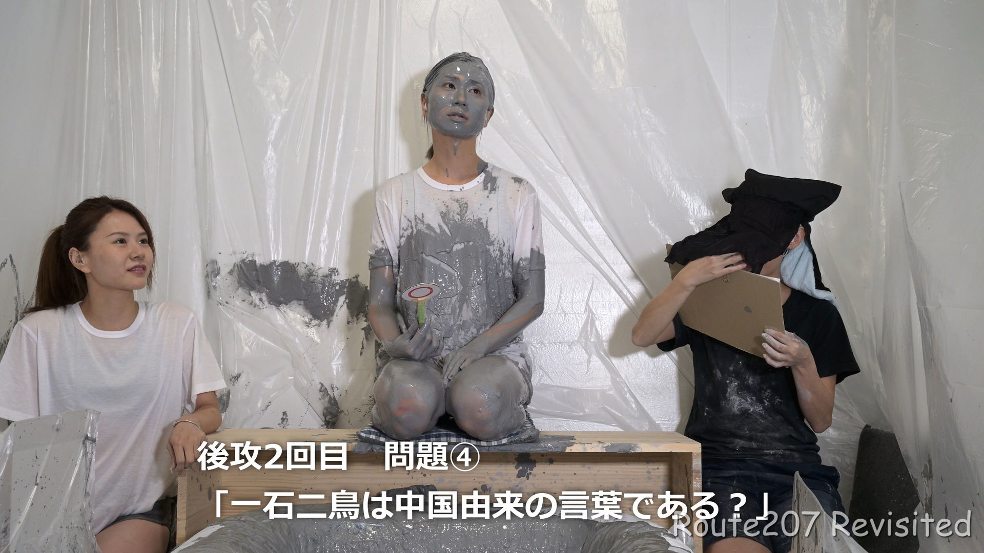 先攻の人は罰ゲームとして追加でもう1回、台座から泥落ちし、そのあと手桶で頭上から泥をかけられました。後攻1回目の泥落ちが動画6分過ぎ、そのあと2人とも正解が続き、先攻1回目の泥落ちは15分過ぎです。作品時間は38分ありますが、このように最初の15分はスローペースです。