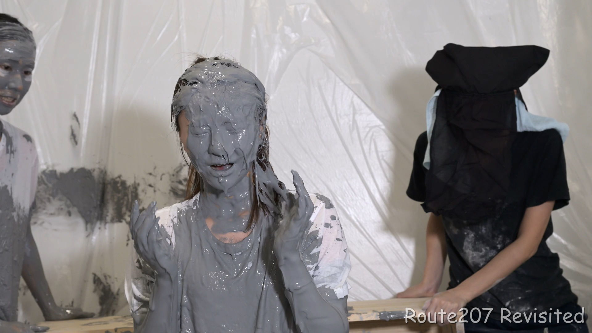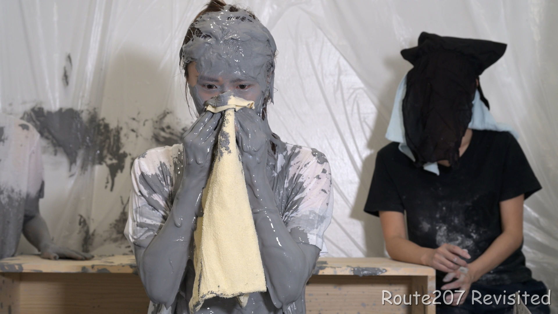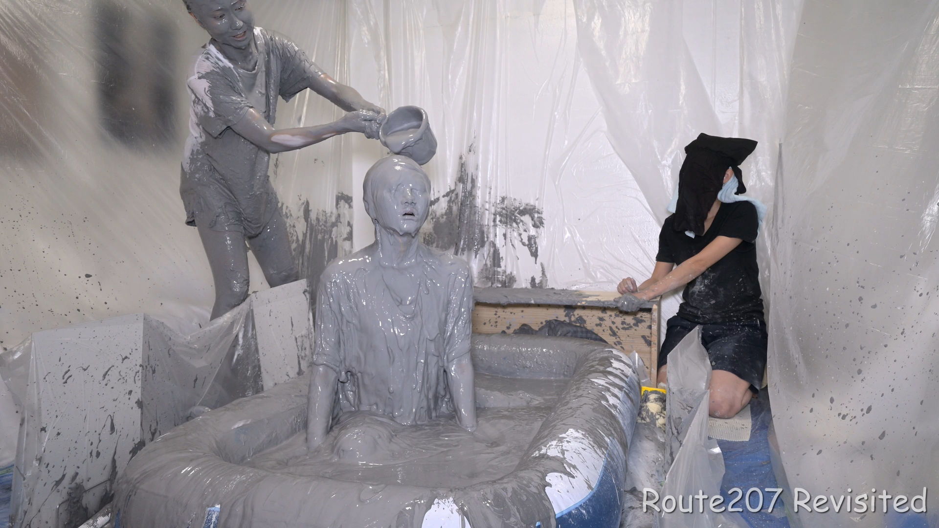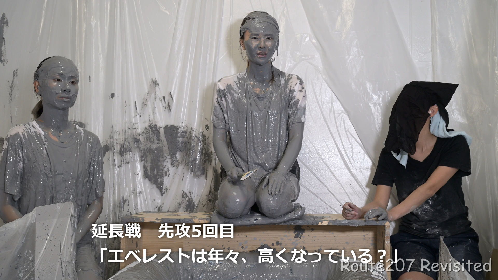 先攻の人は罰ゲームとして追加でもう1回、台座から泥落ちし、そのあと手桶で頭上から泥をかけられました。後攻1回目の泥落ちが動画6分過ぎ、そのあと2人とも正解が続き、先攻1回目の泥落ちは15分過ぎです。作品時間は38分ありますが、このように最初の15分はスローペースです。