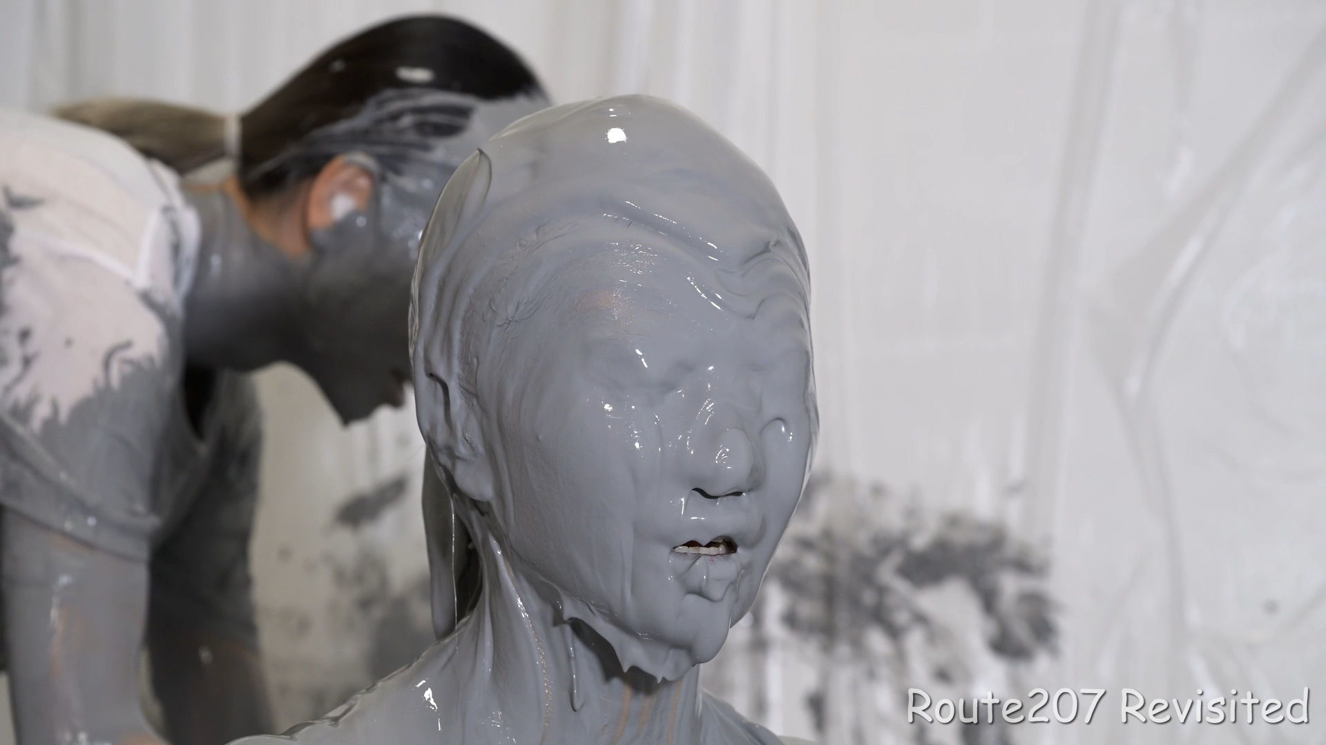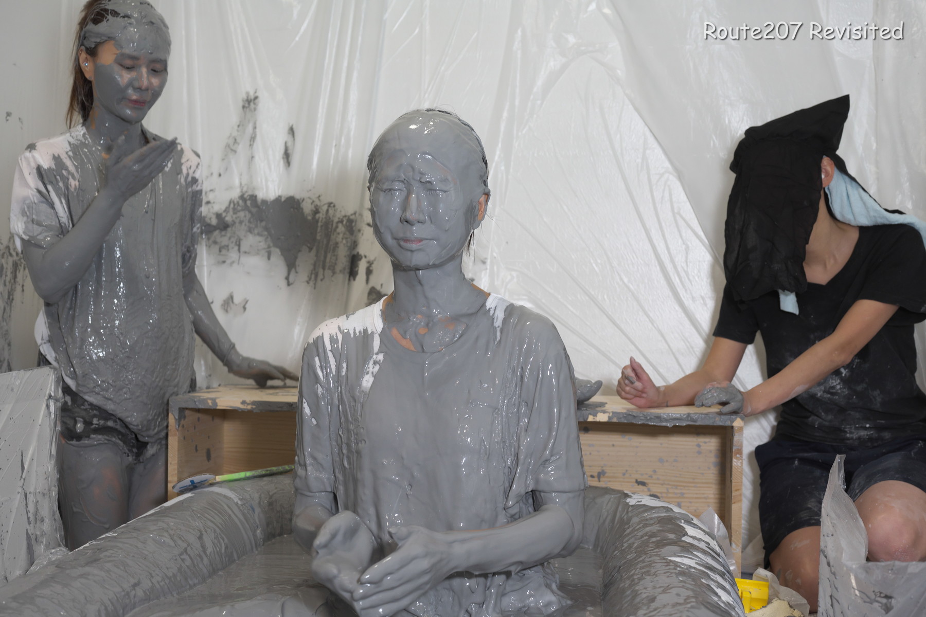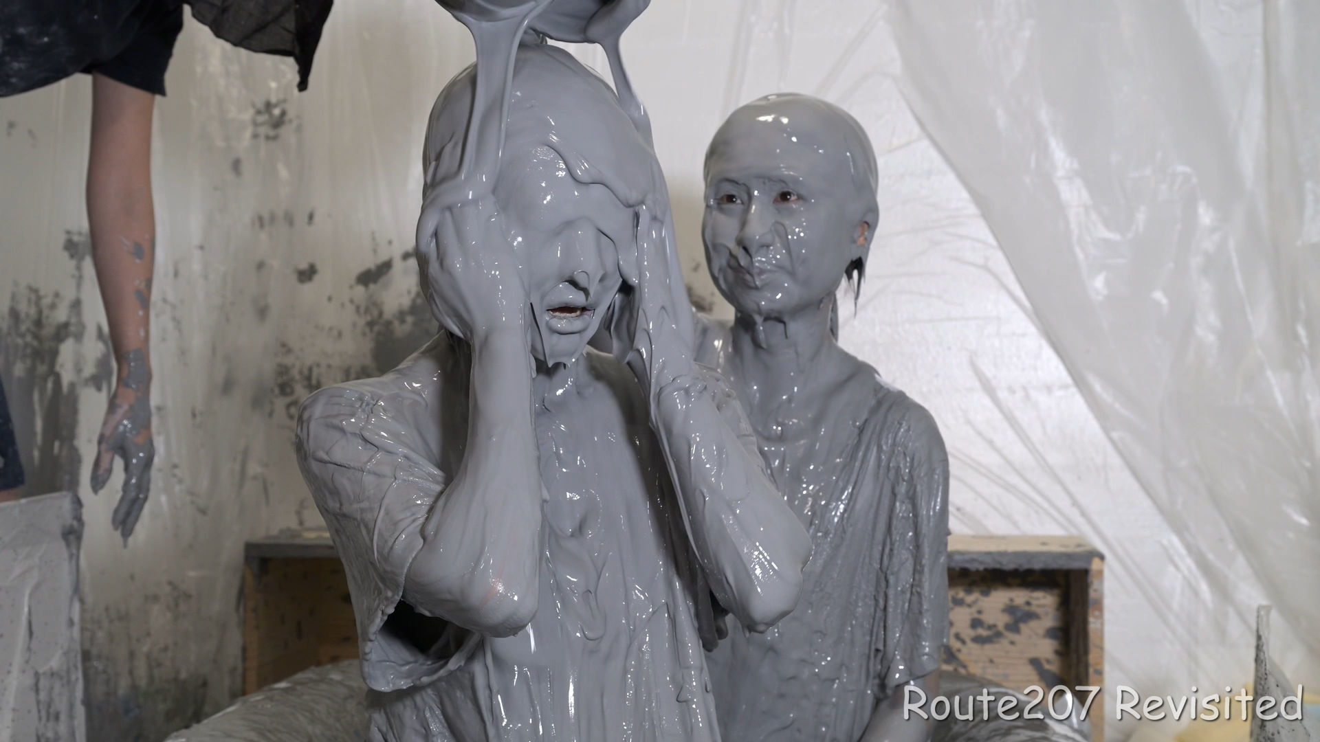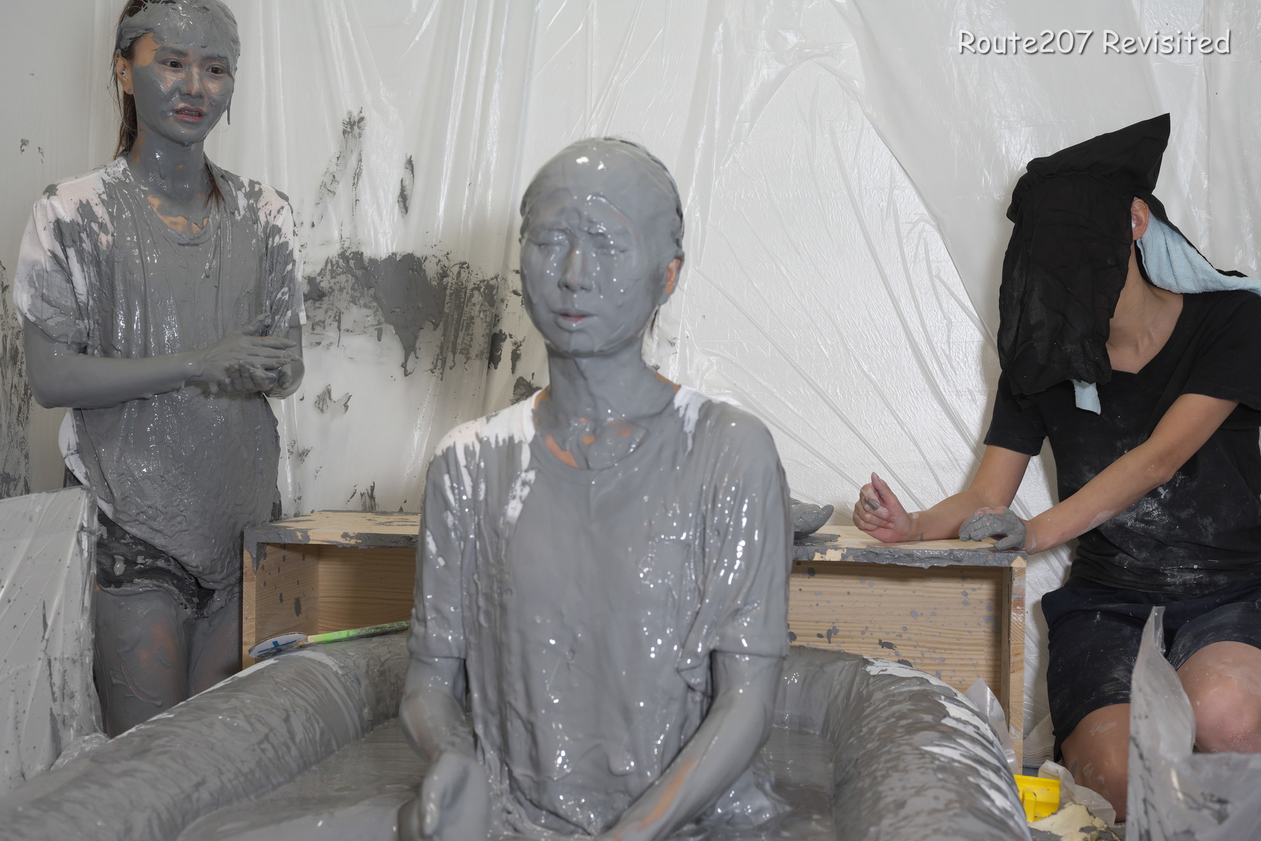 先攻の人は罰ゲームとして追加でもう1回、台座から泥落ちし、そのあと手桶で頭上から泥をかけられました。後攻1回目の泥落ちが動画6分過ぎ、そのあと2人とも正解が続き、先攻1回目の泥落ちは15分過ぎです。作品時間は38分ありますが、このように最初の15分はスローペースです。