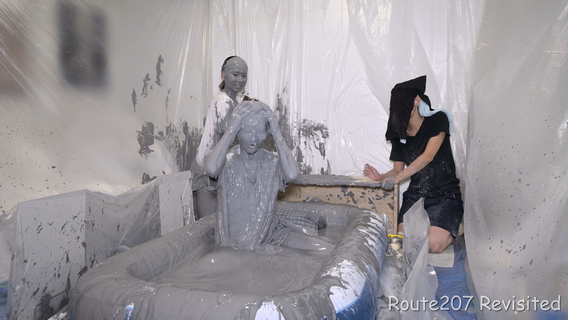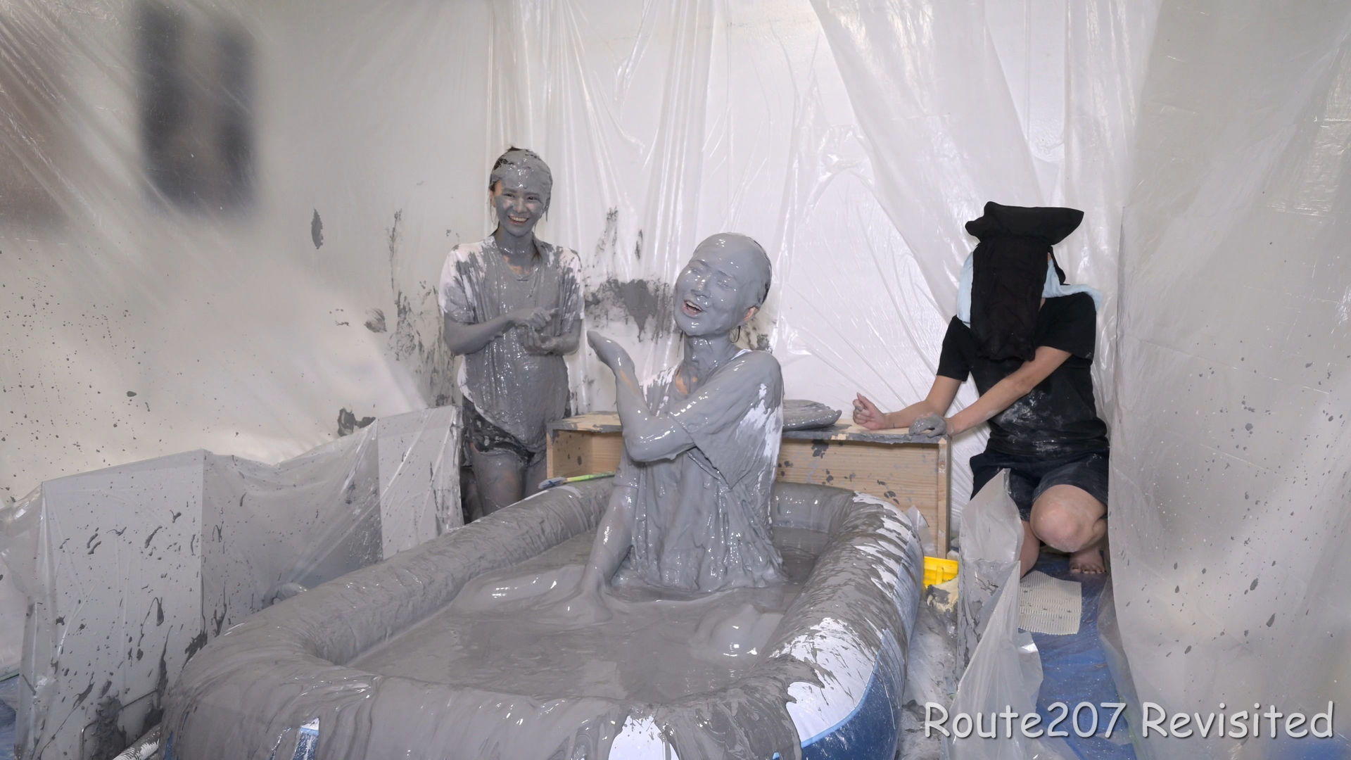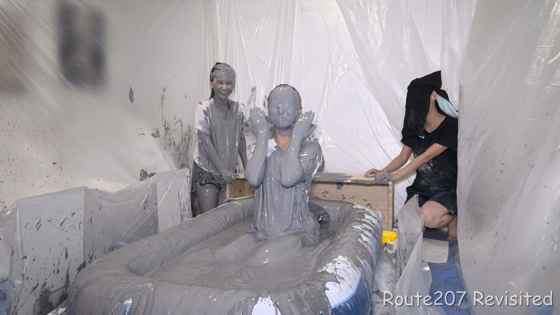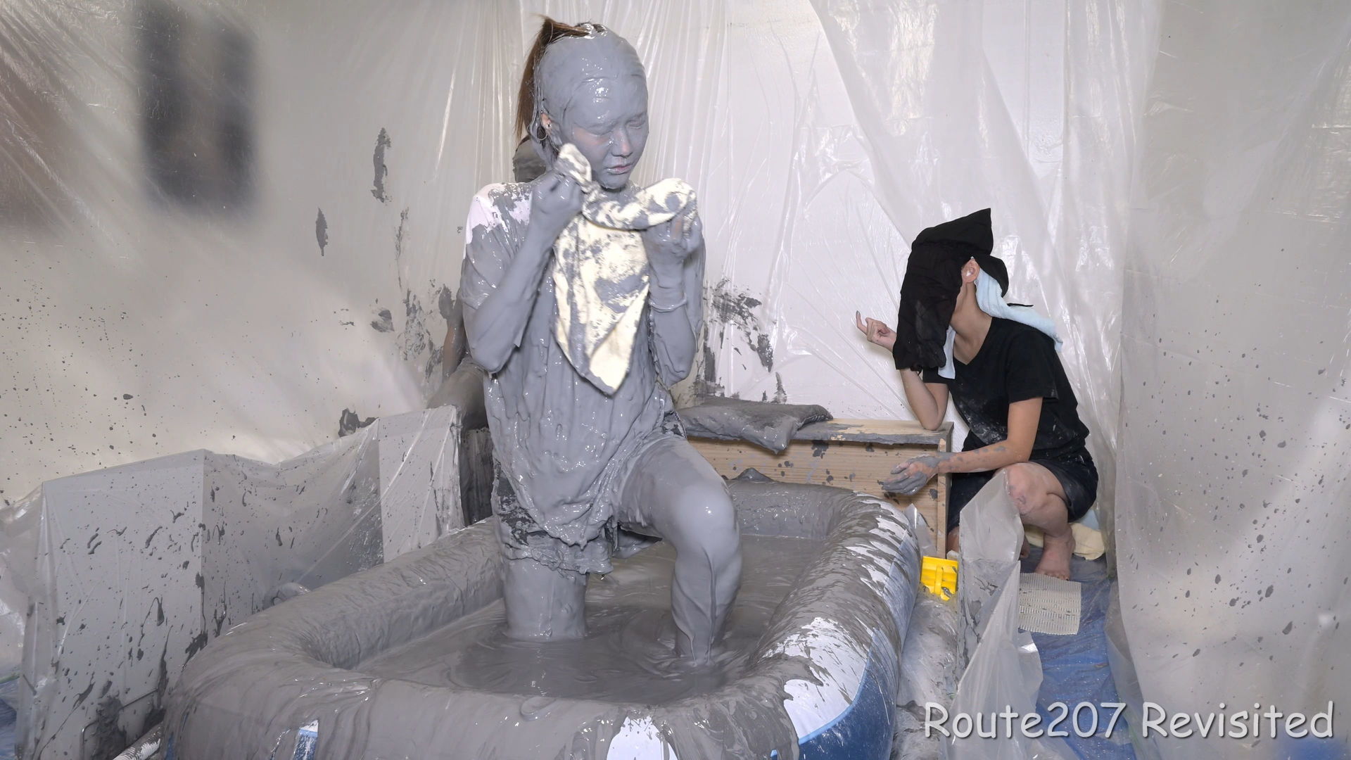 最後は2人ともプールに入って泥んこ遊び状態になり、手桶で泥を浴びたり、寝そべったりしました。泥落ちクイズ以降の顔への泥は、ほぼ上からかけるアクションのみです。