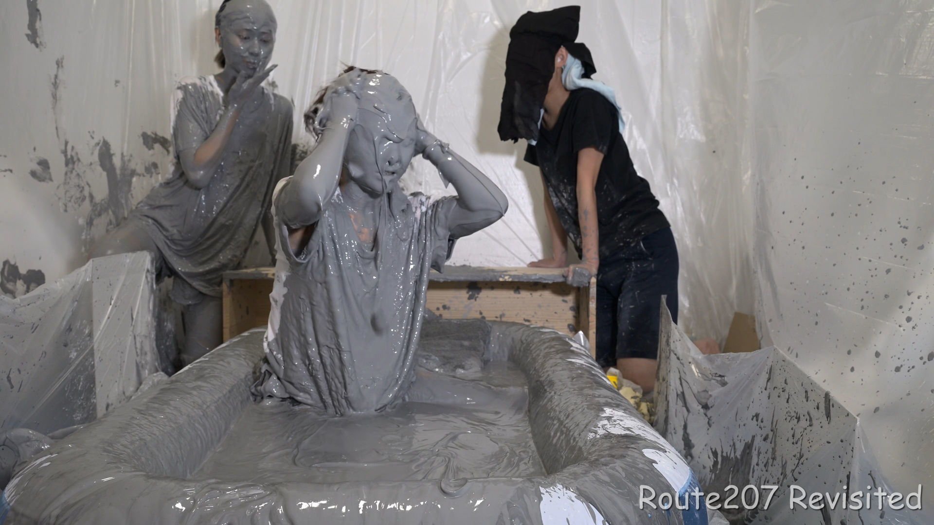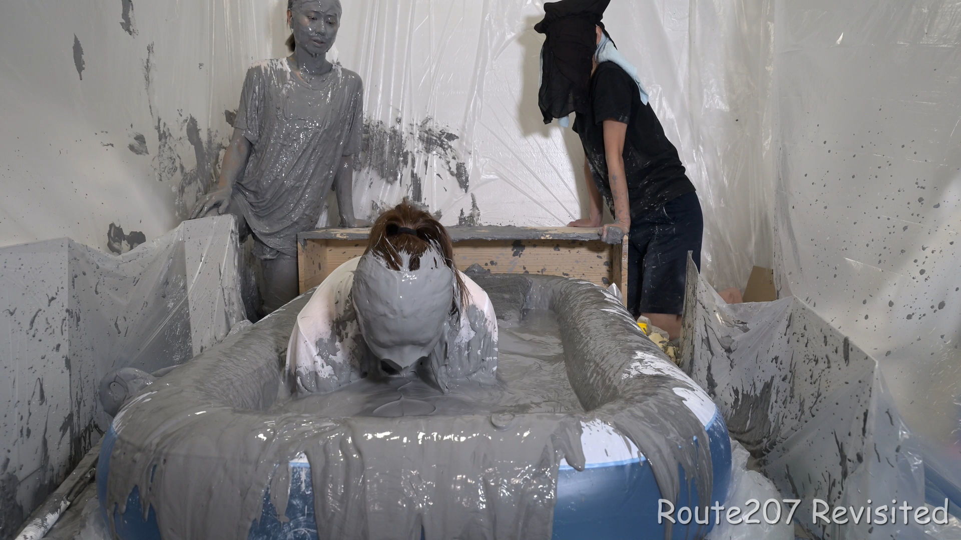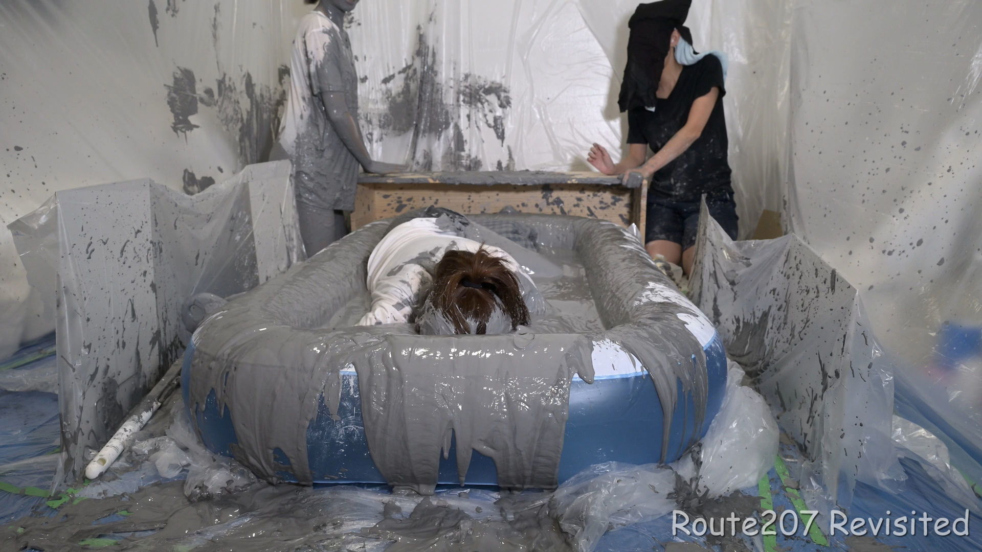 最後は2人ともプールに入って泥んこ遊び状態になり、手桶で泥を浴びたり、寝そべったりしました。泥落ちクイズ以降の顔への泥は、ほぼ上からかけるアクションのみです。