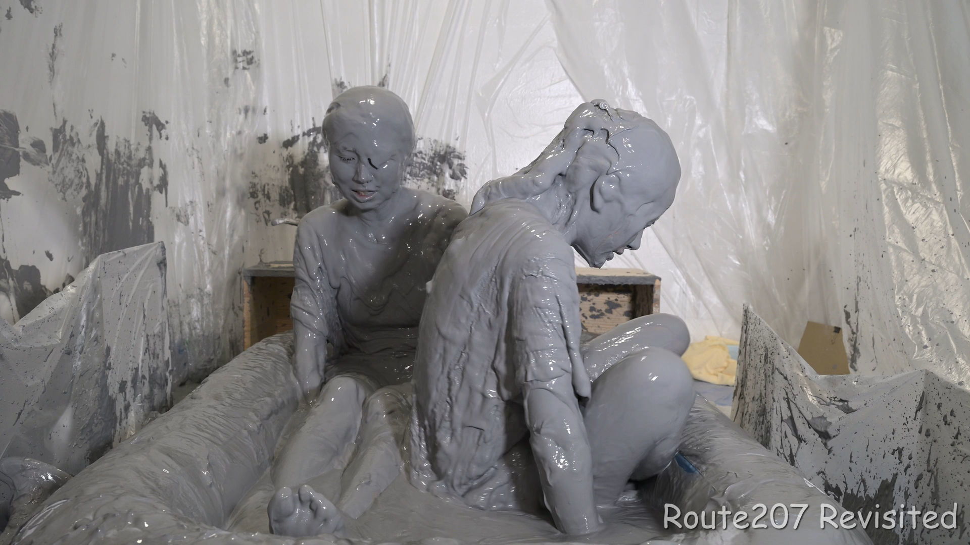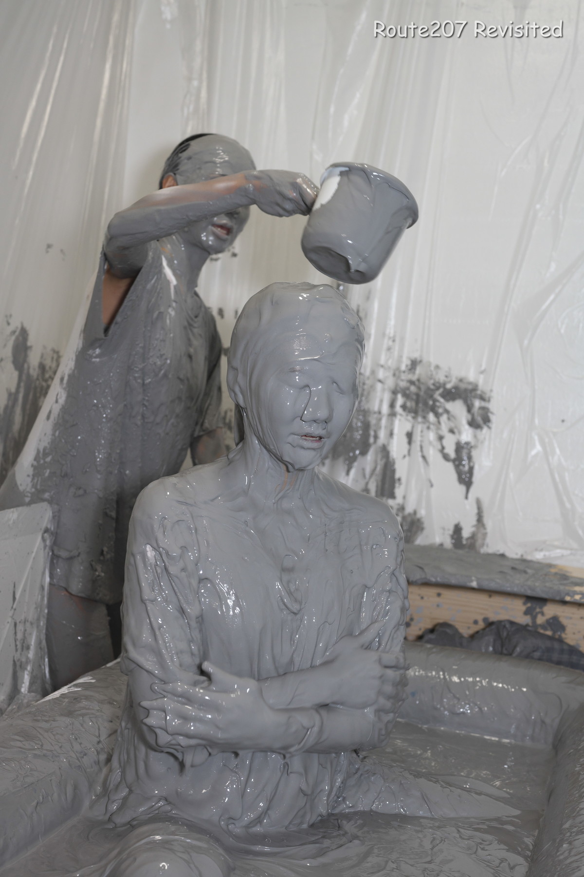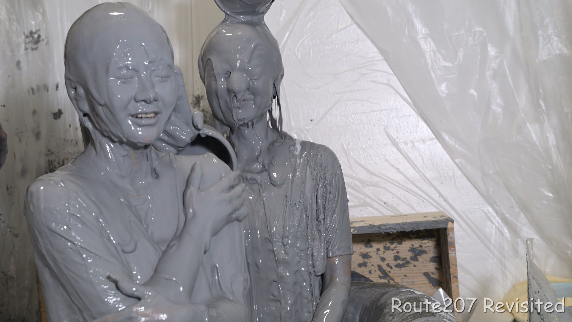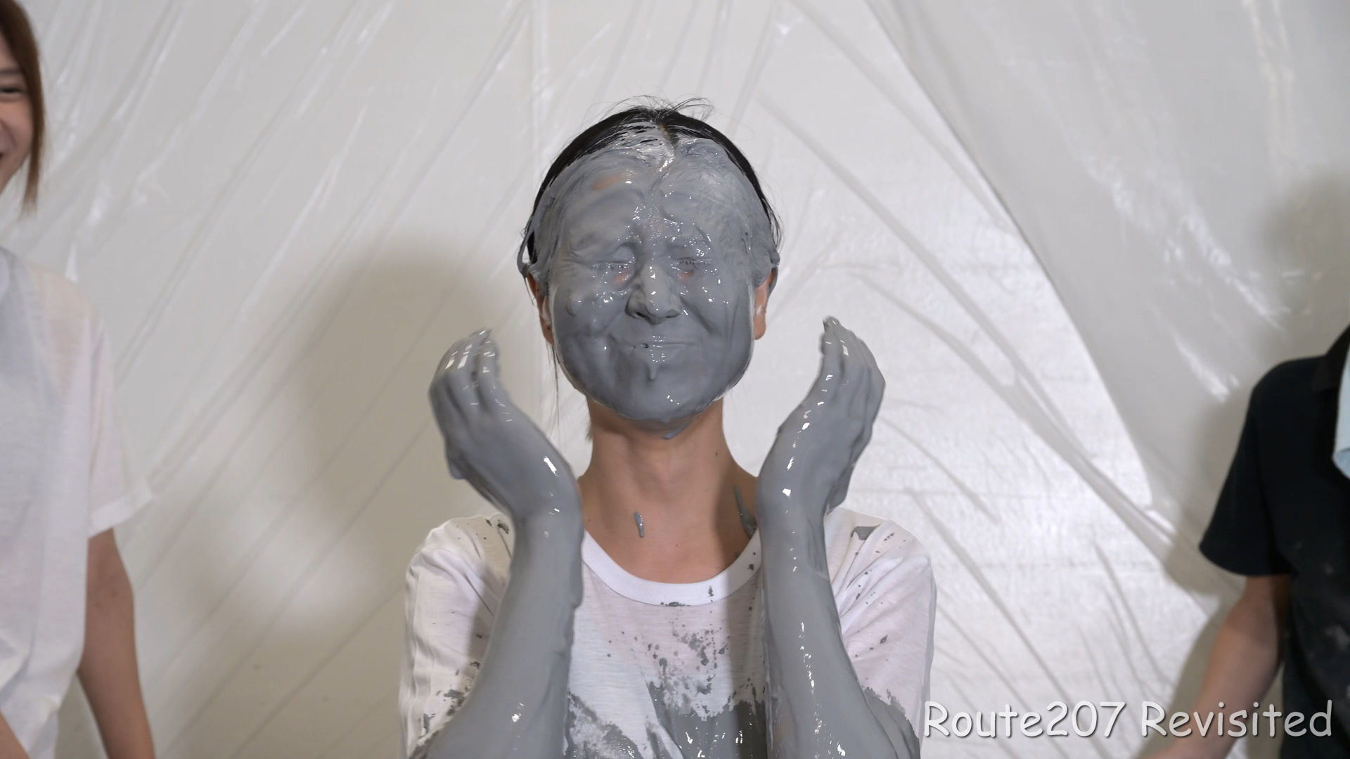 最後は2人ともプールに入って泥んこ遊び状態になり、手桶で泥を浴びたり、寝そべったりしました。泥落ちクイズ以降の顔への泥は、ほぼ上からかけるアクションのみです。