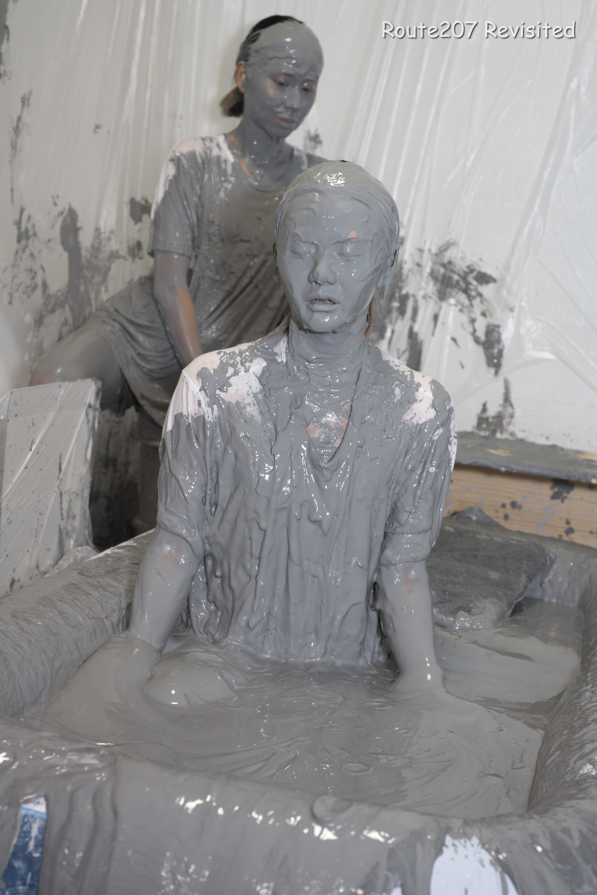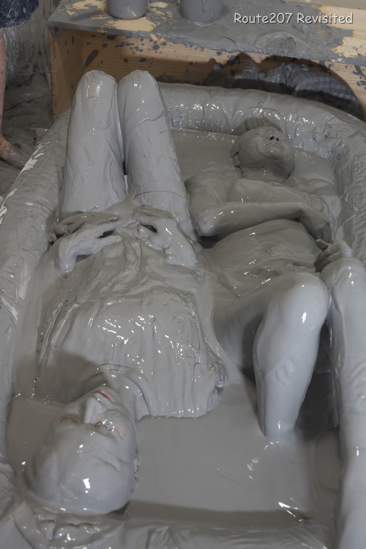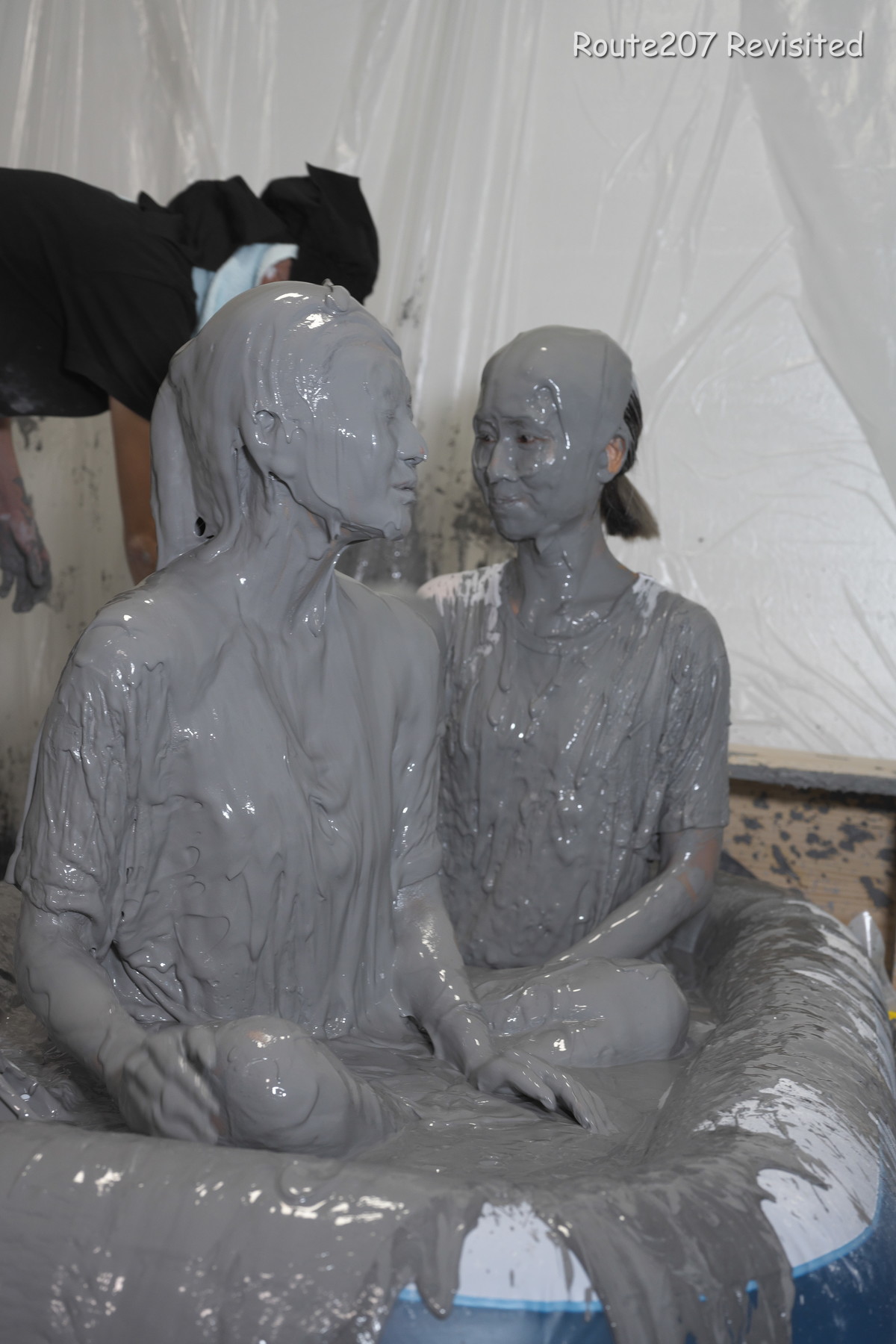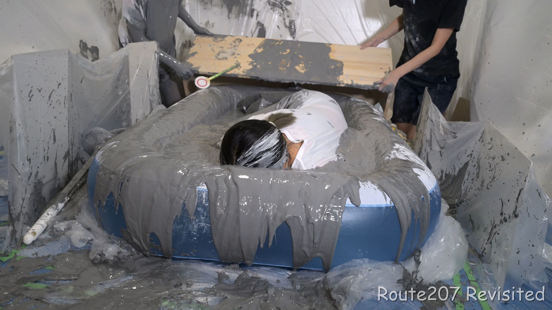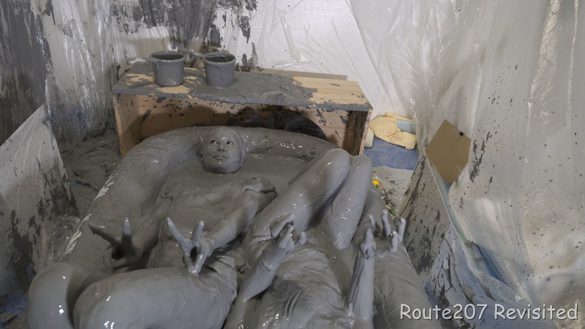 プールサイズの制約もあって泥の落下はかなりコツと勇気が必要で、先攻の人のほうが勢い良く落ちていました。派手に落ちて一度だけで体の前面にまんべんなく泥が付くという感じではありませんので、その点はサンプル動画とキャプチャ画像もご覧ください。