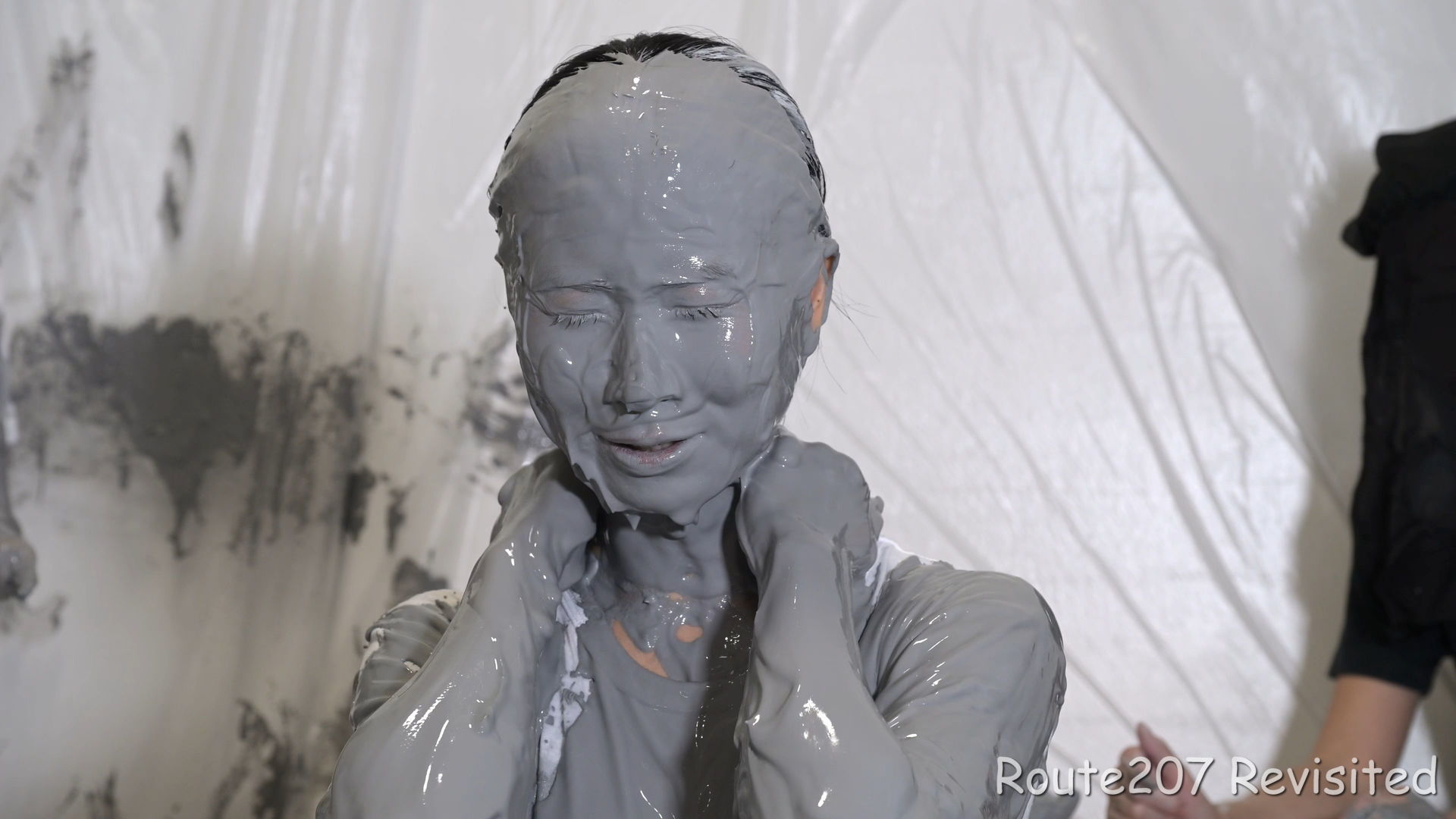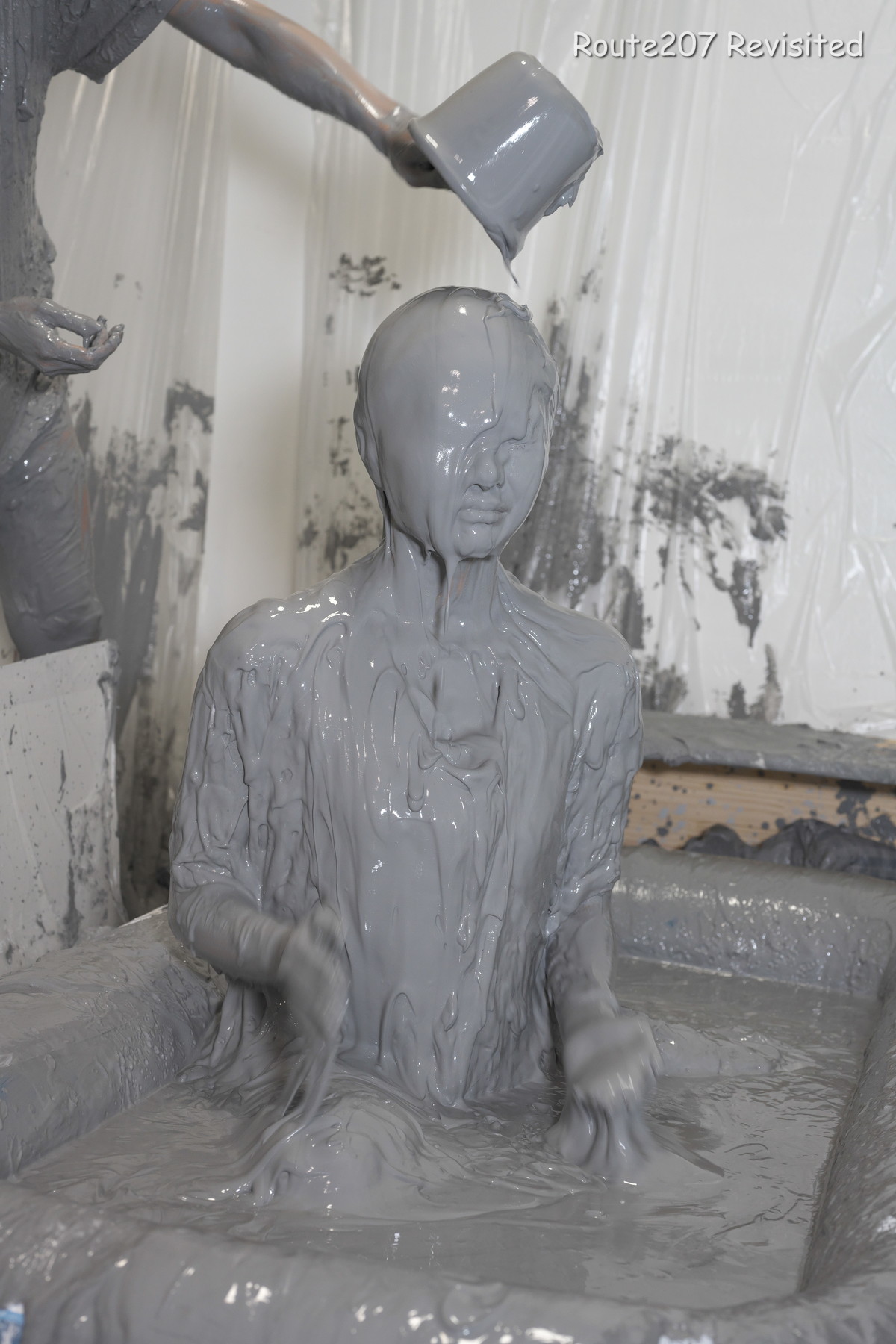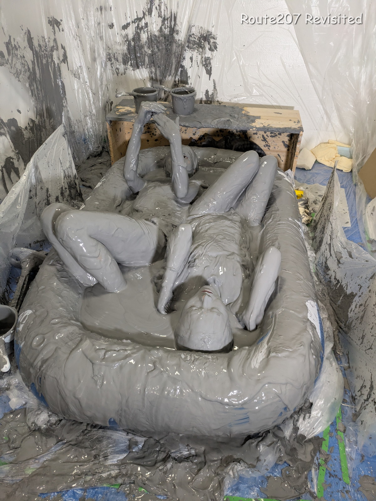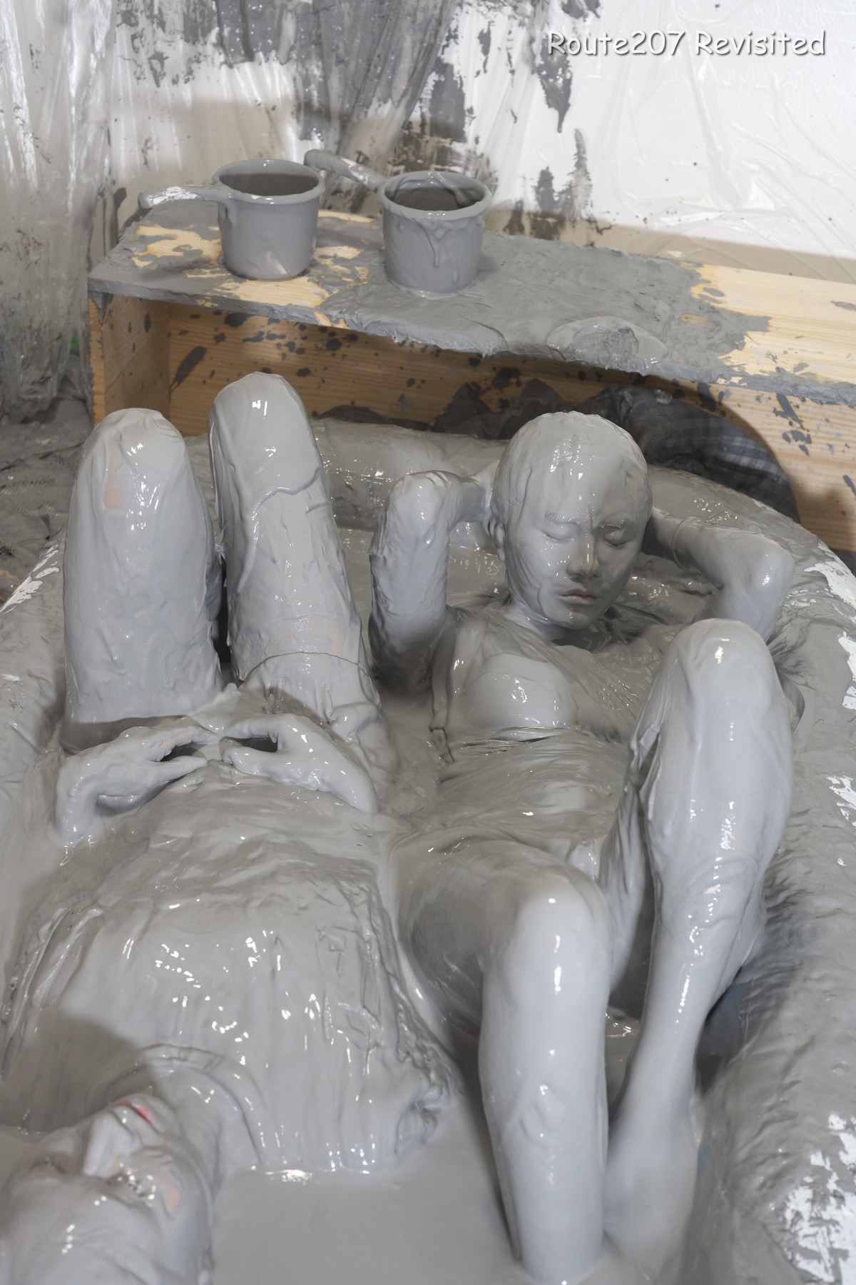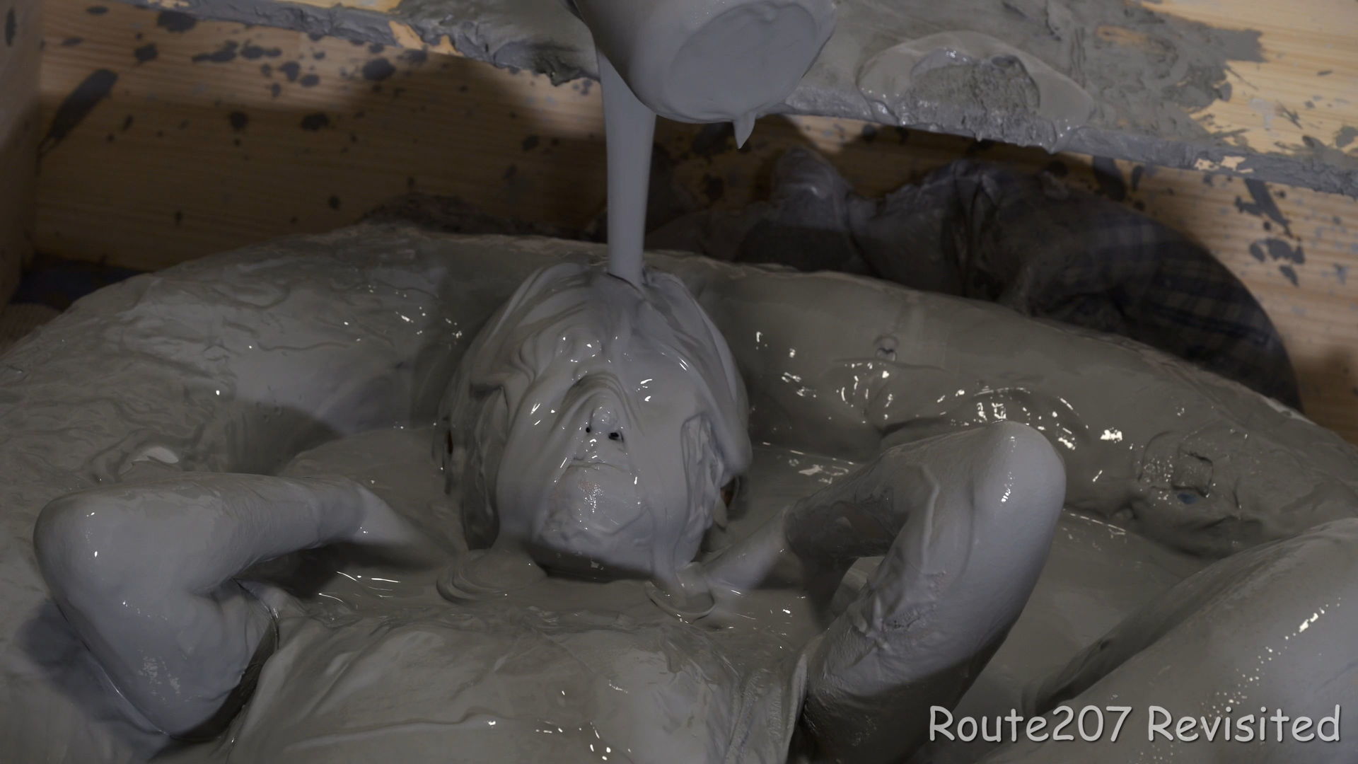 プールサイズの制約もあって泥の落下はかなりコツと勇気が必要で、先攻の人のほうが勢い良く落ちていました。派手に落ちて一度だけで体の前面にまんべんなく泥が付くという感じではありませんので、その点はサンプル動画とキャプチャ画像もご覧ください。