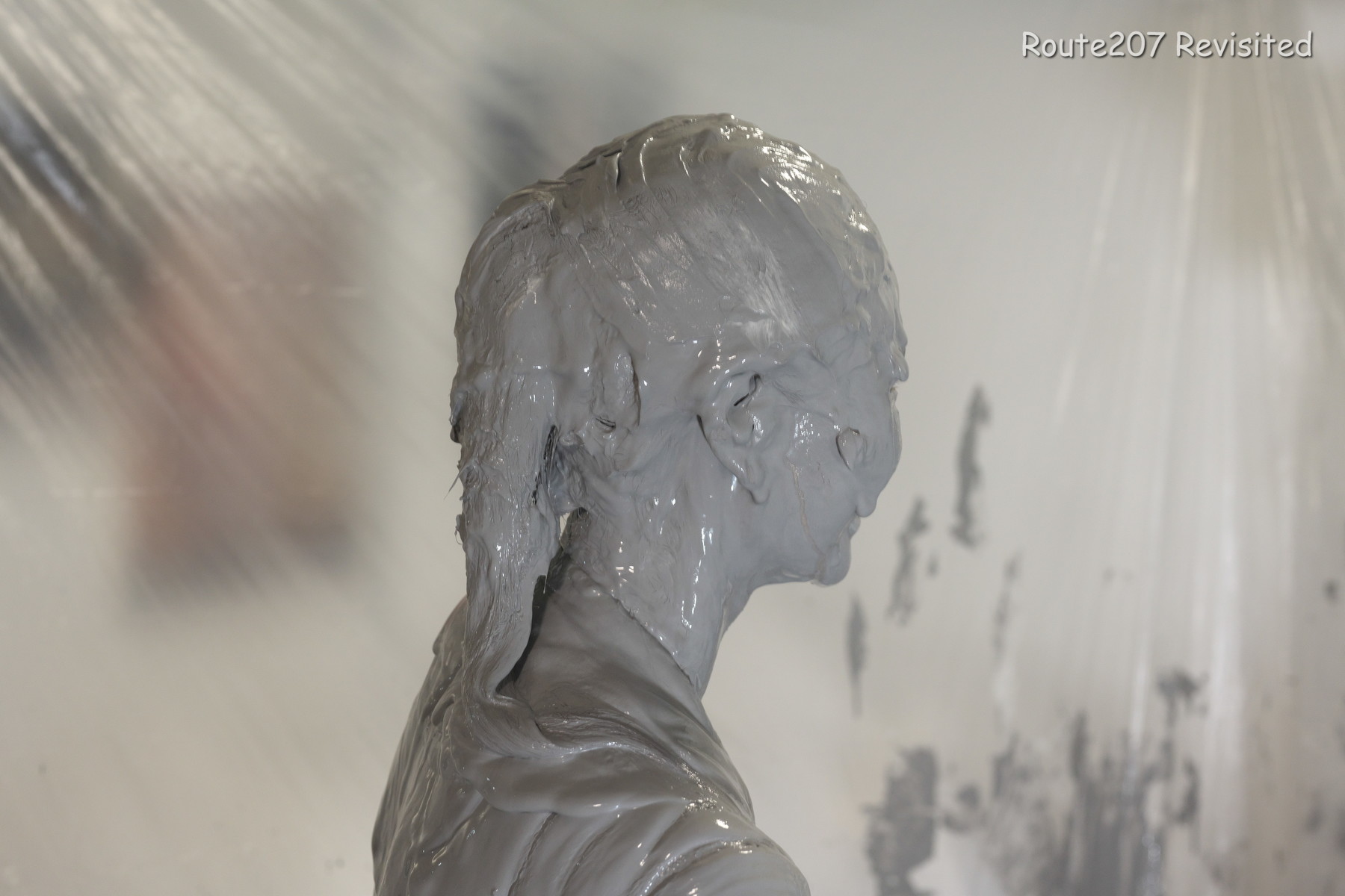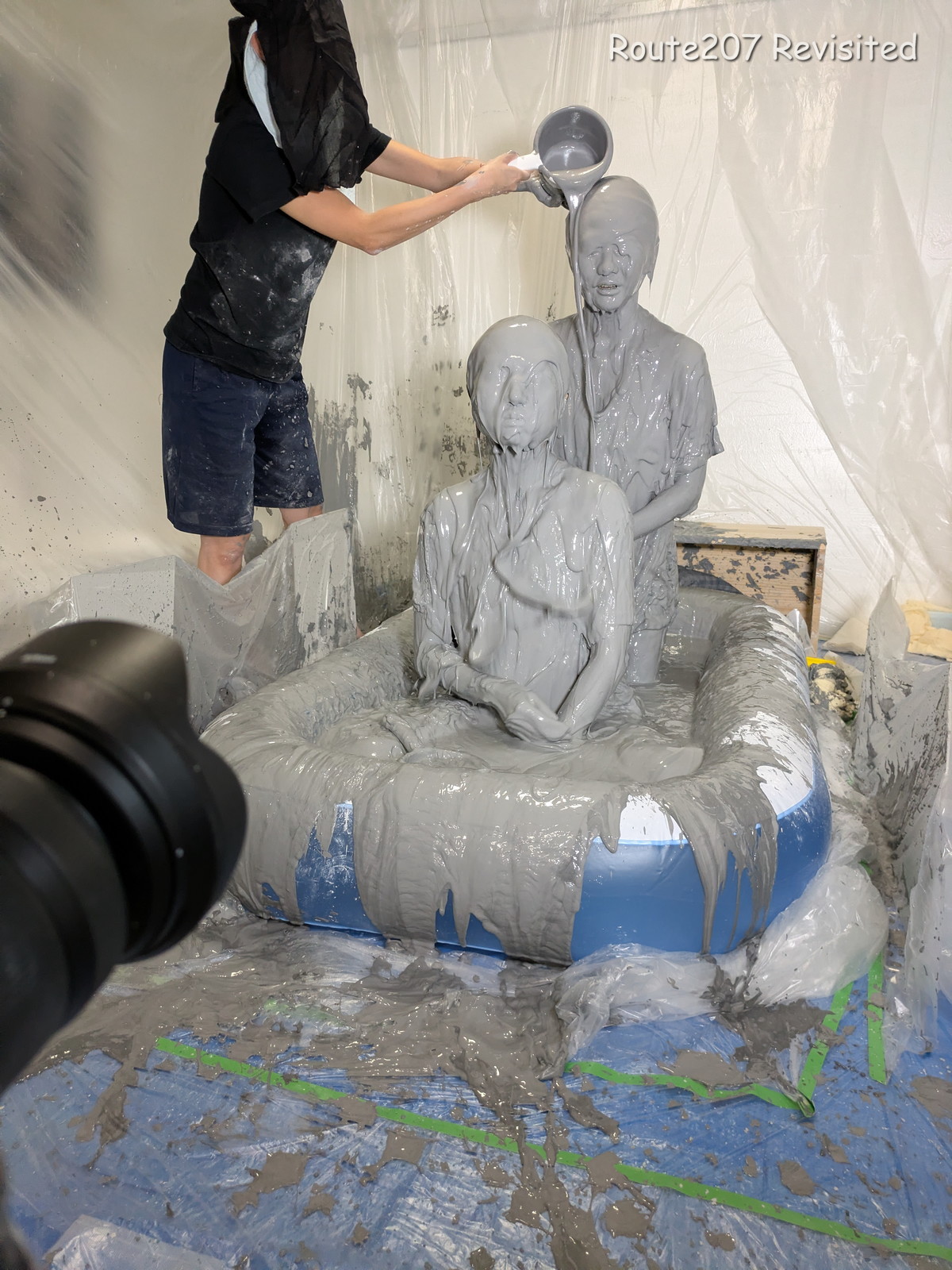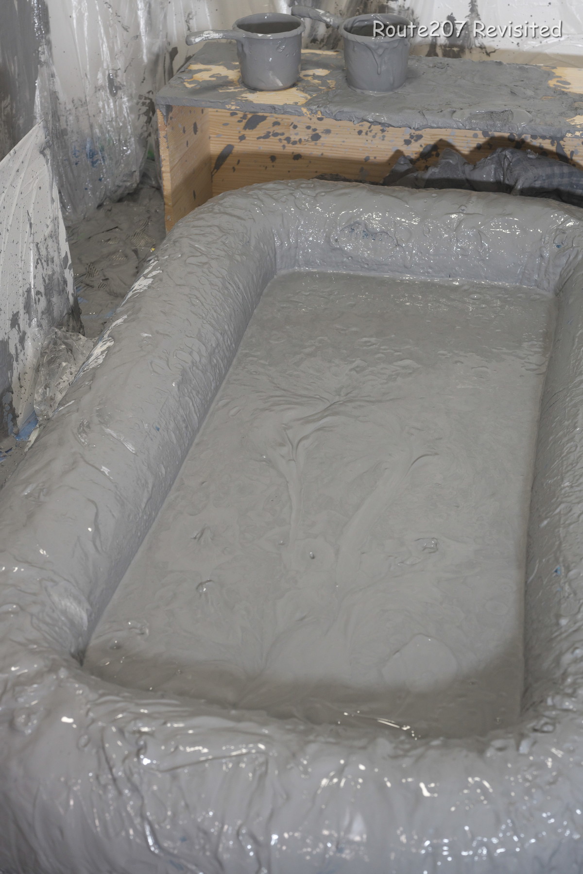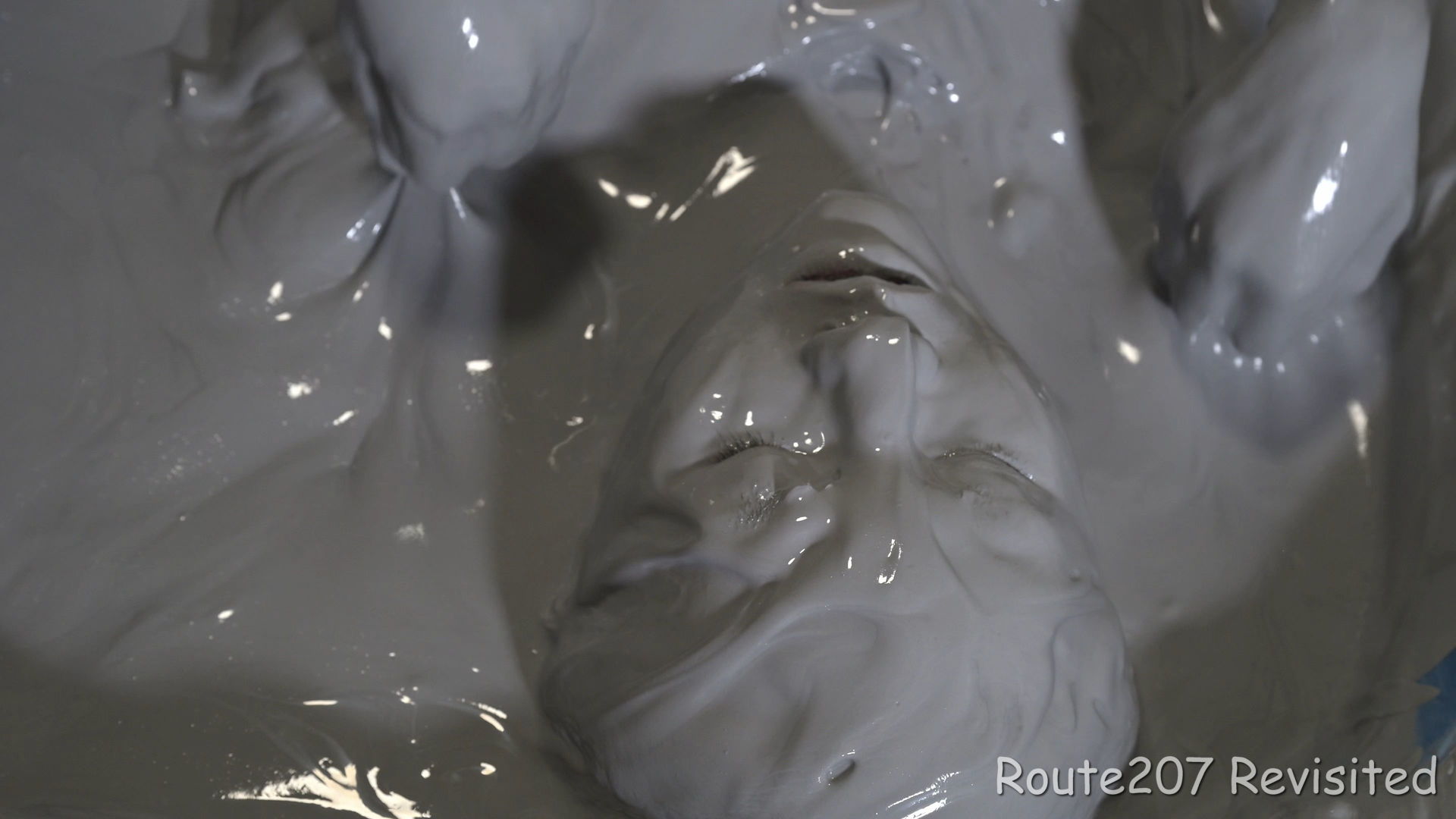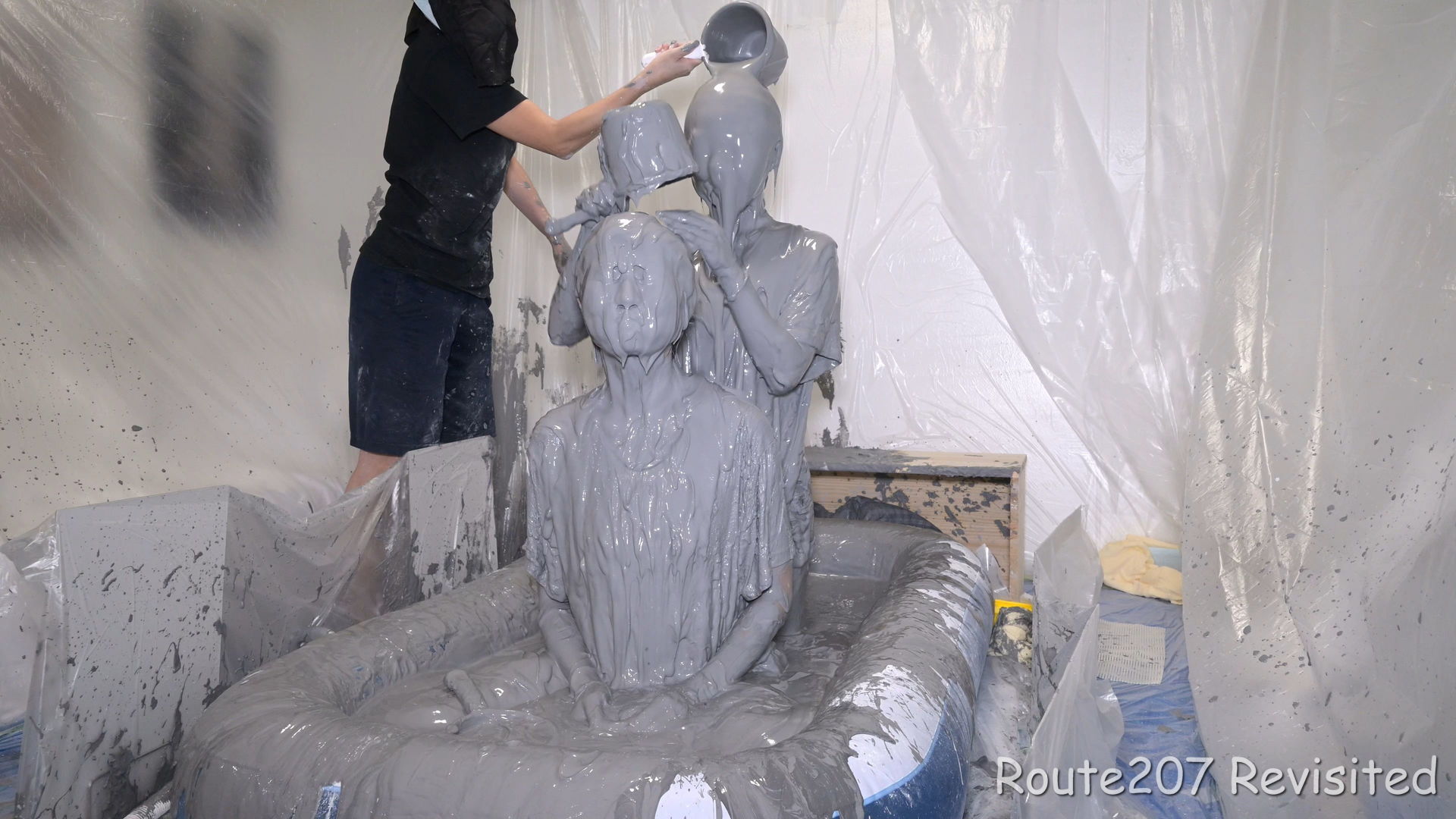 プールサイズの制約もあって泥の落下はかなりコツと勇気が必要で、先攻の人のほうが勢い良く落ちていました。派手に落ちて一度だけで体の前面にまんべんなく泥が付くという感じではありませんので、その点はサンプル動画とキャプチャ画像もご覧ください。