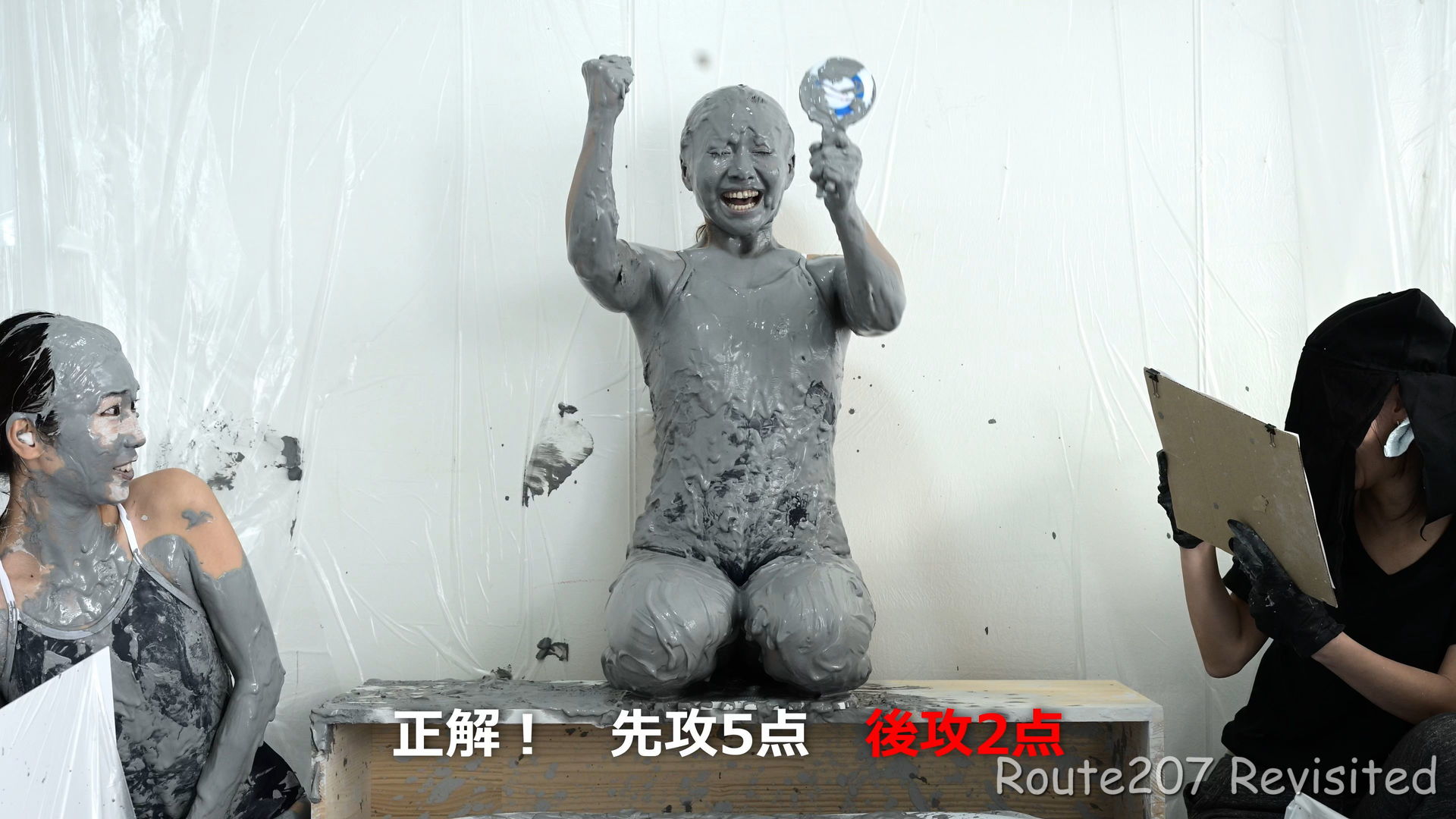 モデルさん2人による泥落ちクイズ対決の2回目です(第1回は「室内泥んこ その7 泥落ちクイズ」)。解答者は泥のビニールプールの前に置かれた台に座り、○×クイズ(マルバツクイズ)に挑戦して、不正解の場合には台が傾けられ、泥に落とされます。クイズは8問用意され、事前に示される「ジャンル」と「得点」を頼りに2人が交互に問題番号を選んで回答していきます。得点は2点の問題が4個、1点が4個あり、最終的に合計得点が高かったほうが勝ちになります。