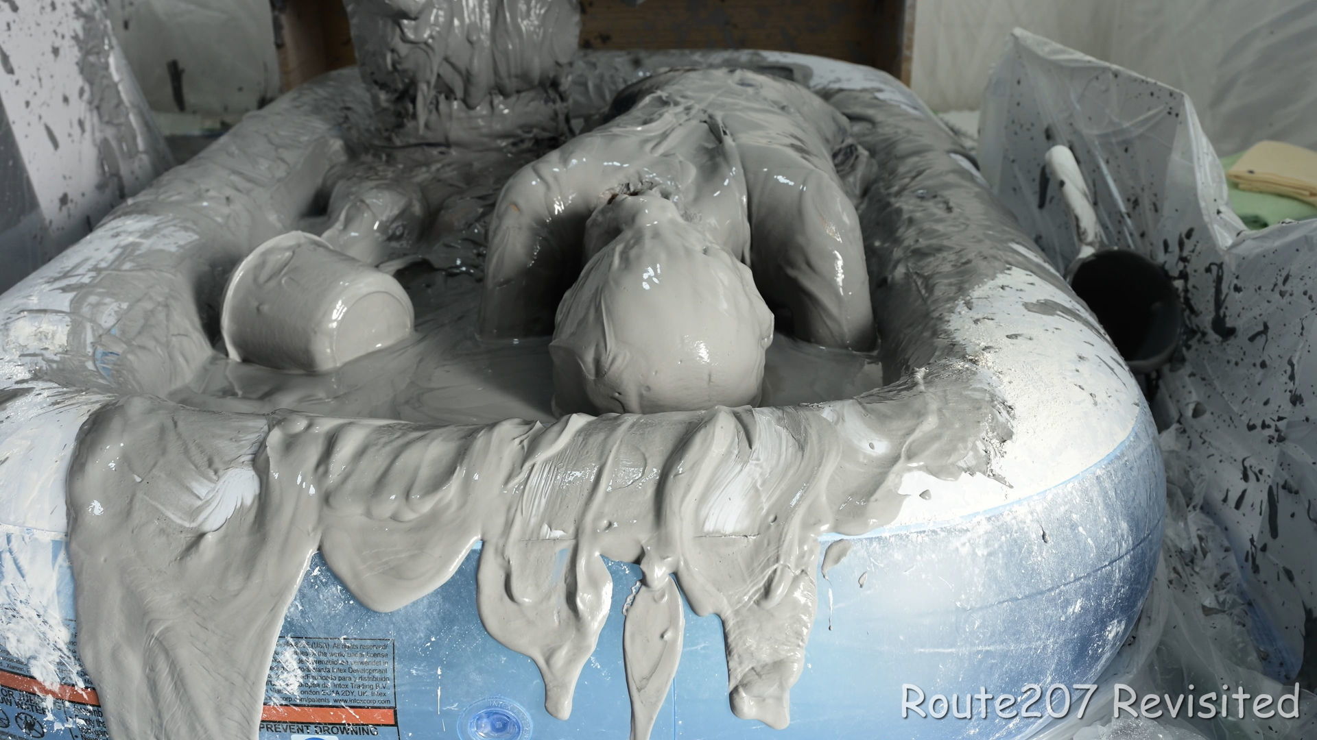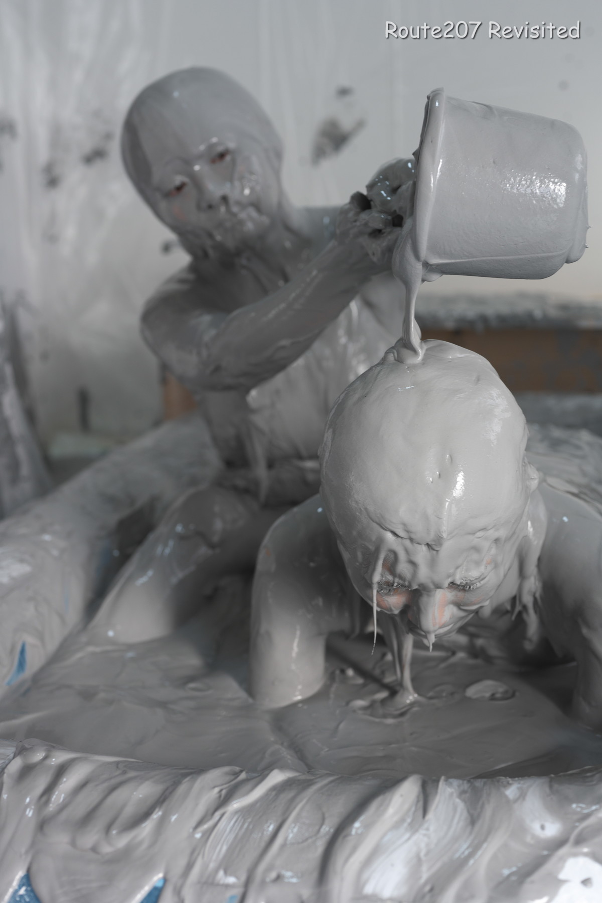 後半、20分過ぎからはお二人で自由に泥んこ遊びをして、上からかけあったりしています。後攻の人は「室内泥んこ その5」でも泥を経験されていることから、泥の中での動きにはやや慣れた感じで、とても楽しんでおられました。