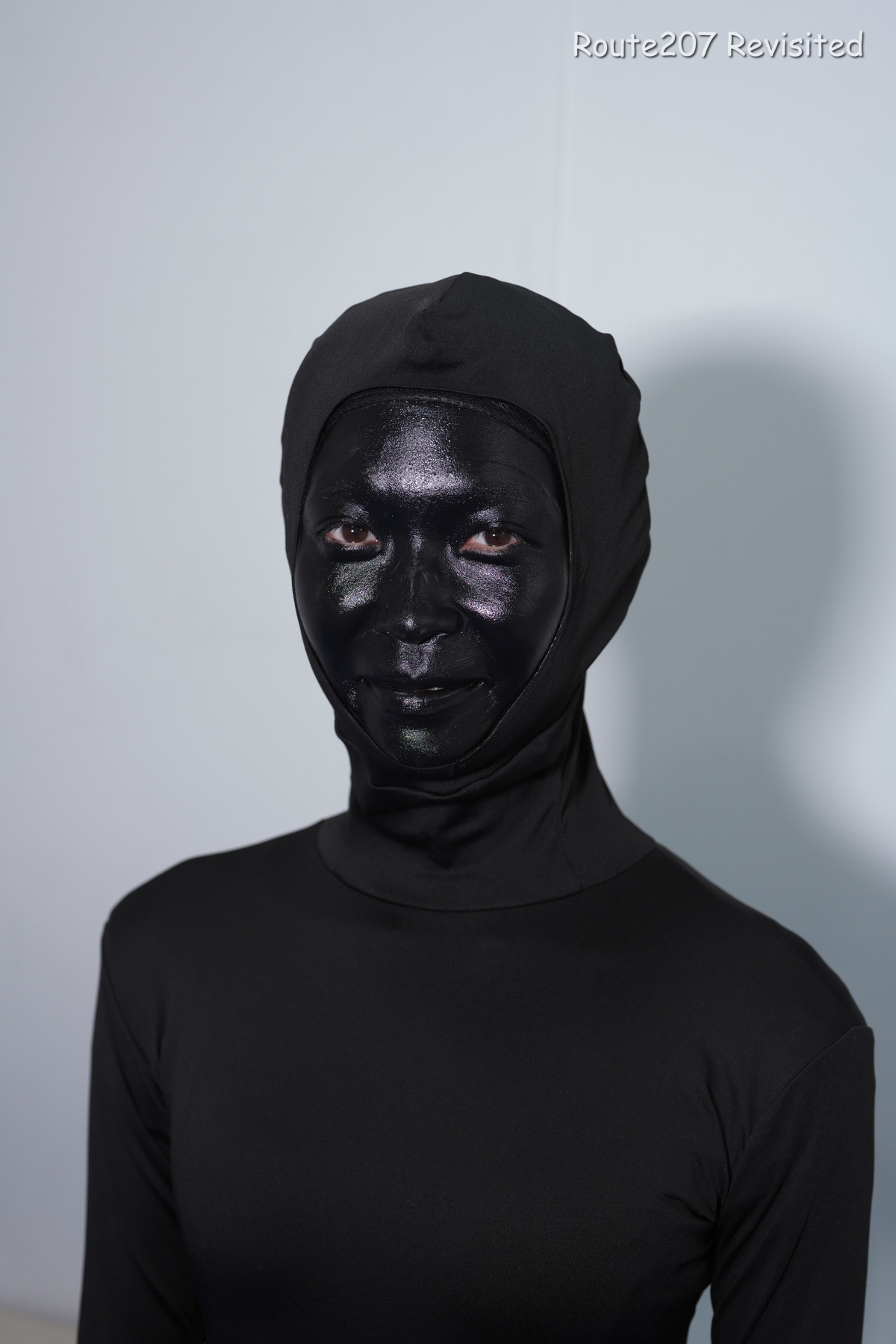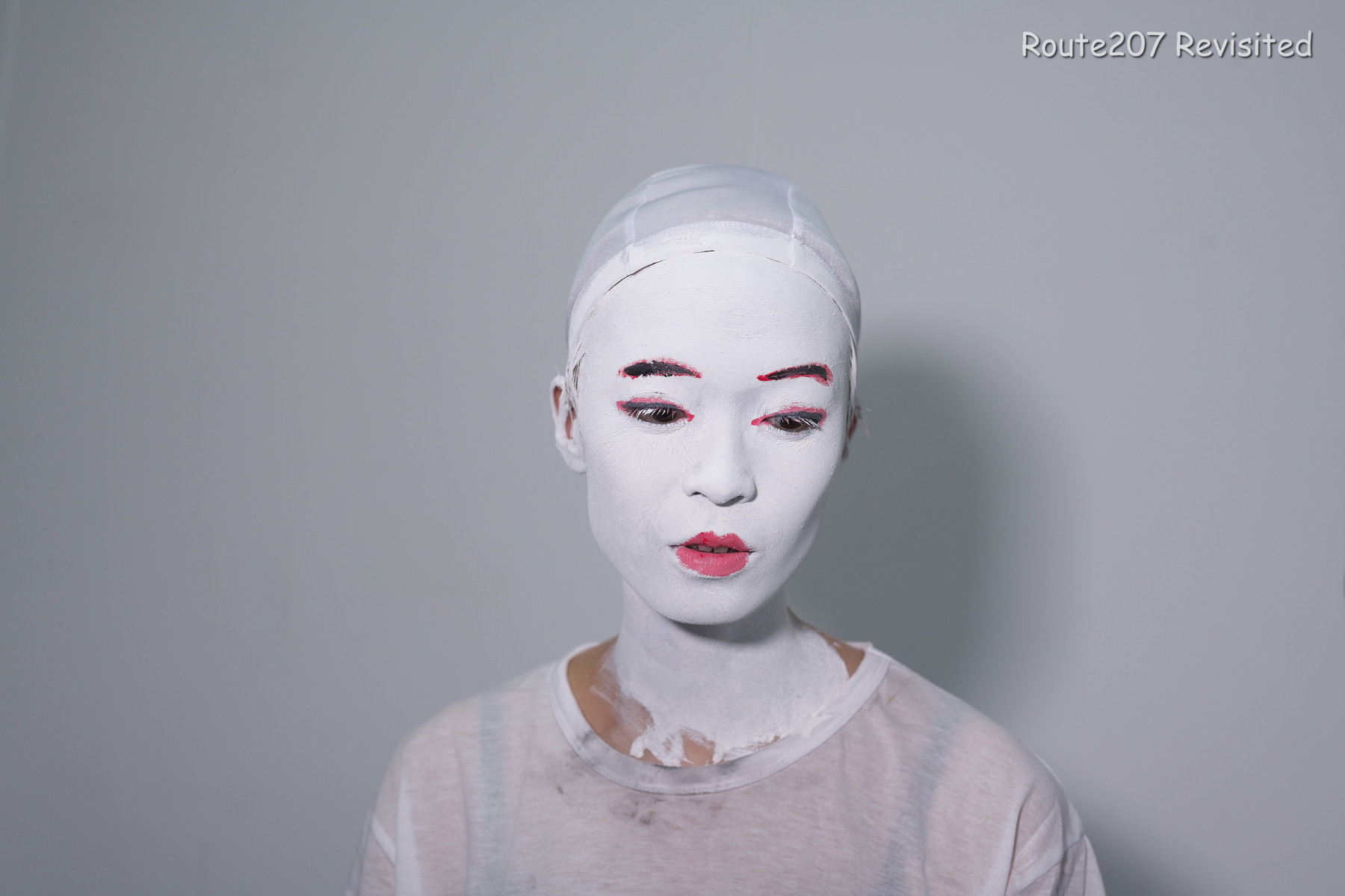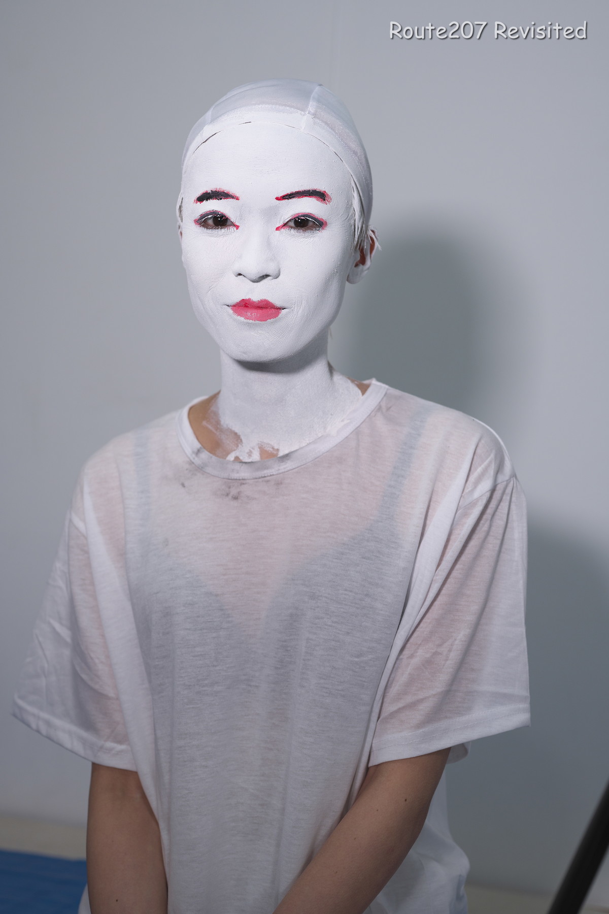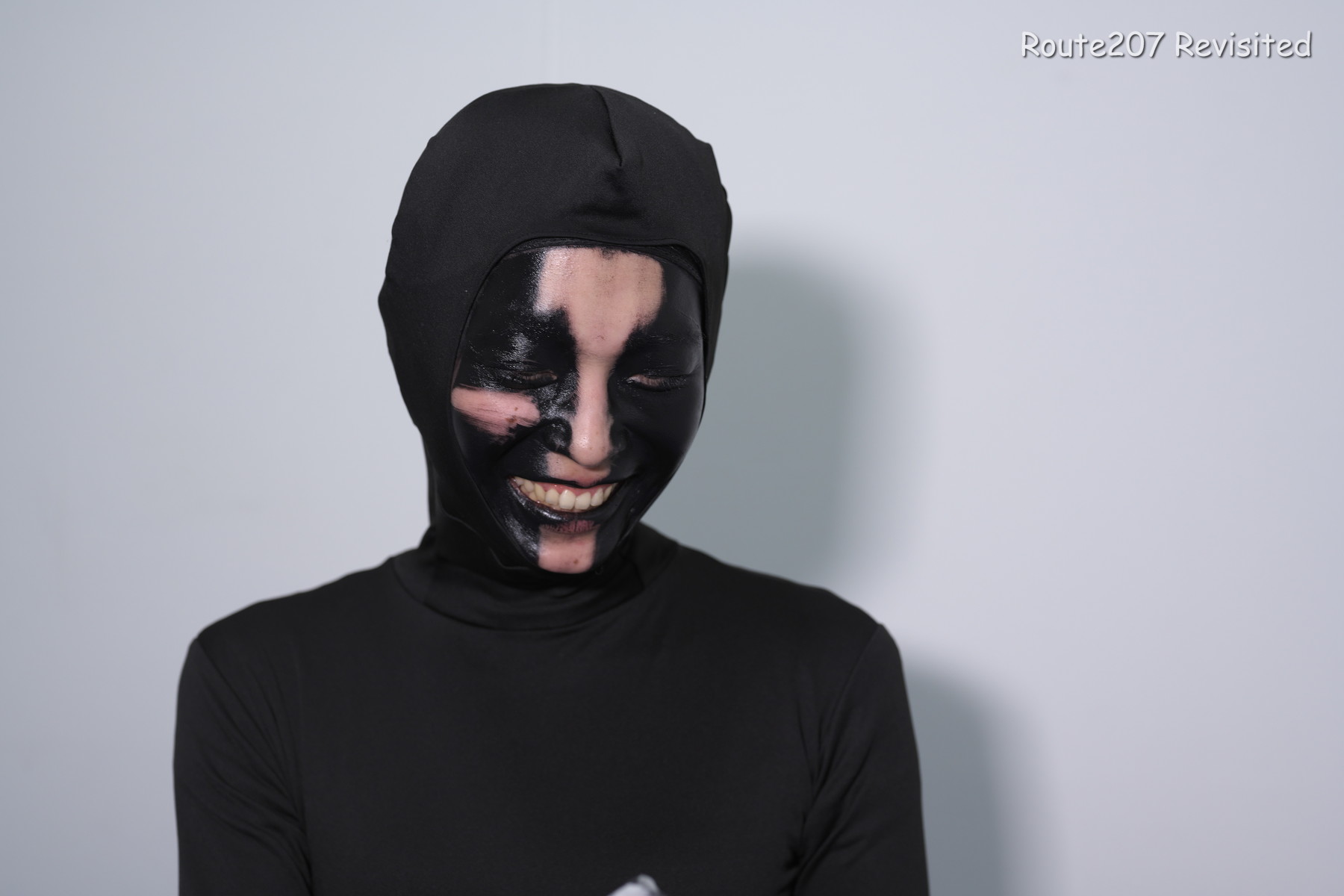 黒のほうは顔出し全身タイツも着て、まさかこんな格好ができるとは、と感動しておられました。サブタイトルの「白シャツより白い」は、モデルさんが白塗りの白さを鏡で見て言ったコメントを元にしています。