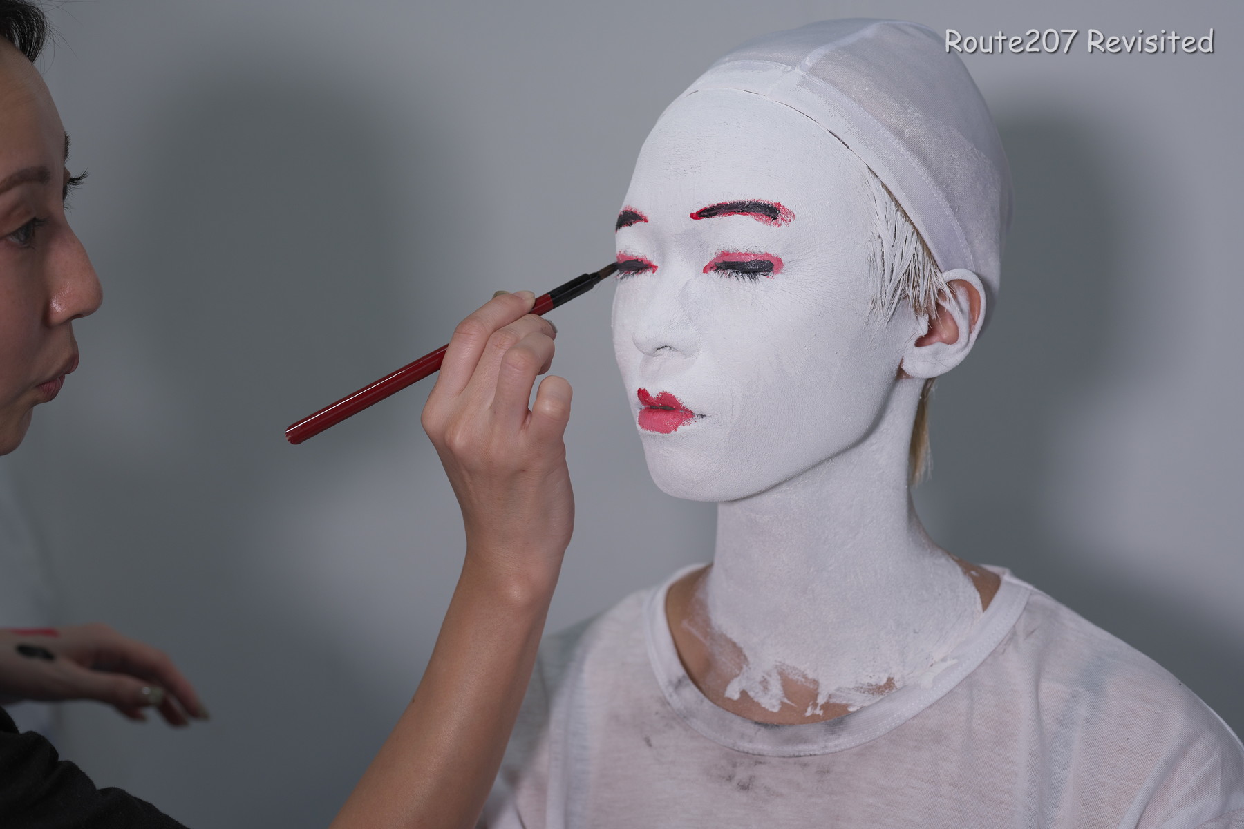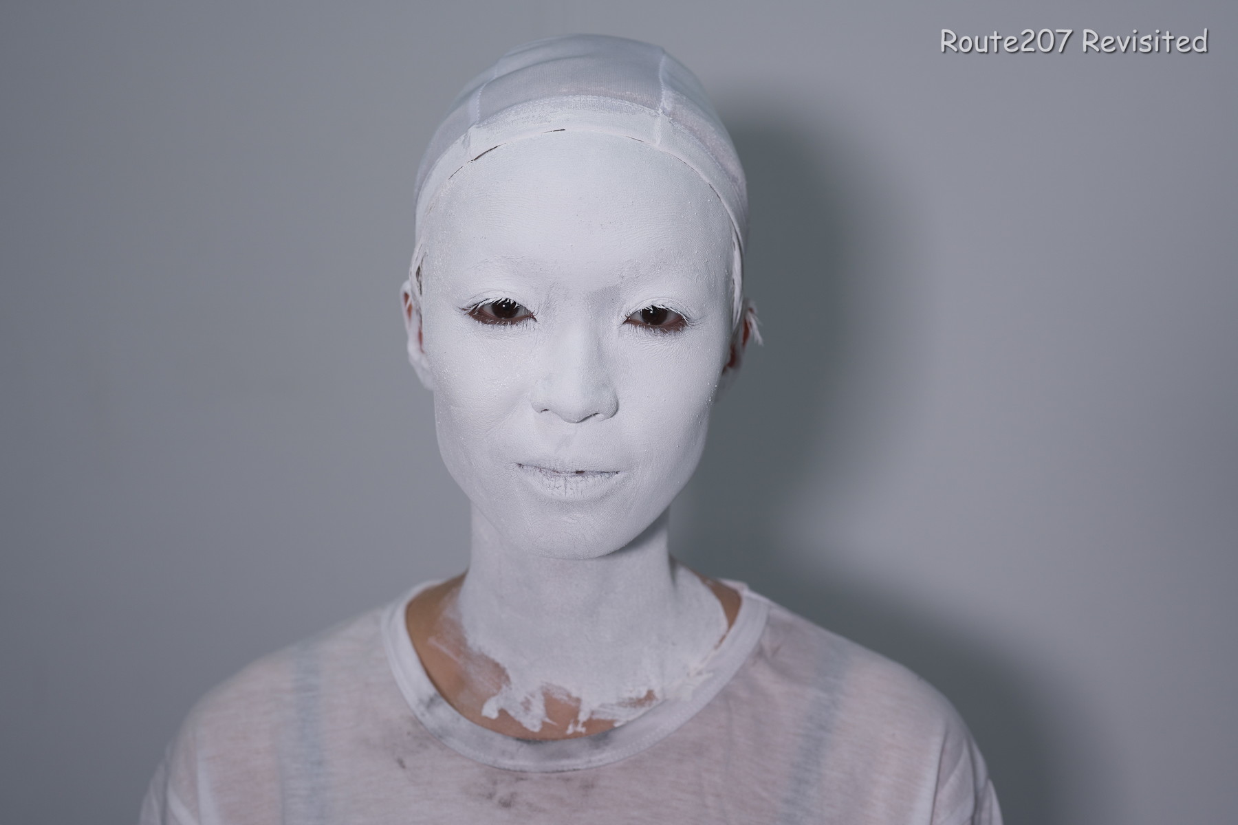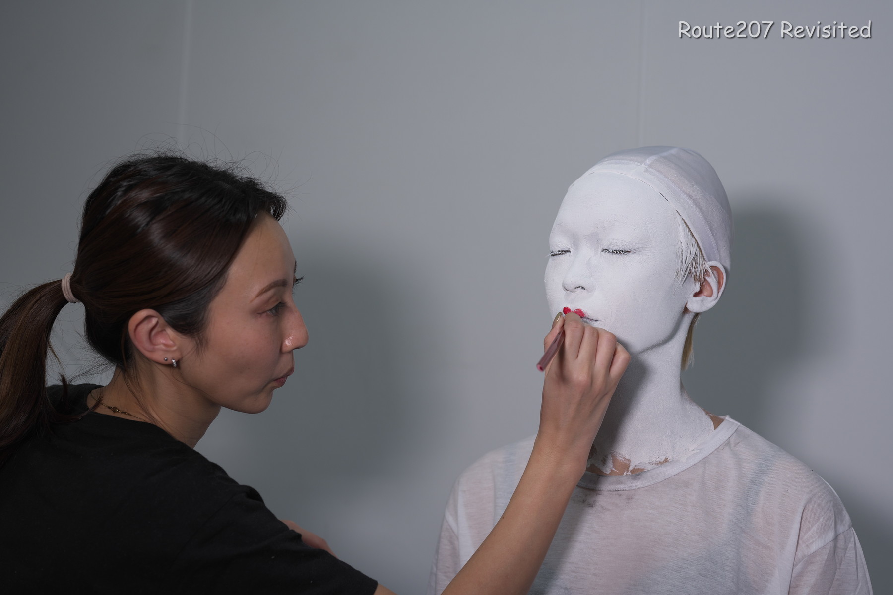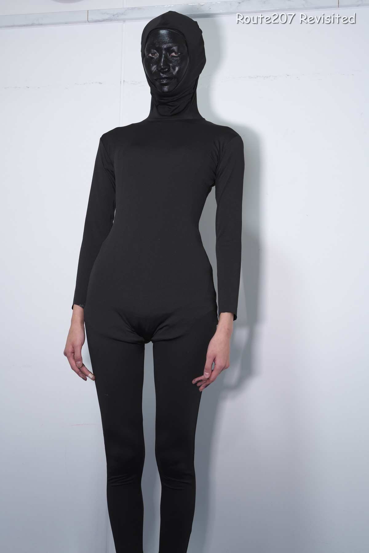 黒のほうは顔出し全身タイツも着て、まさかこんな格好ができるとは、と感動しておられました。サブタイトルの「白シャツより白い」は、モデルさんが白塗りの白さを鏡で見て言ったコメントを元にしています。